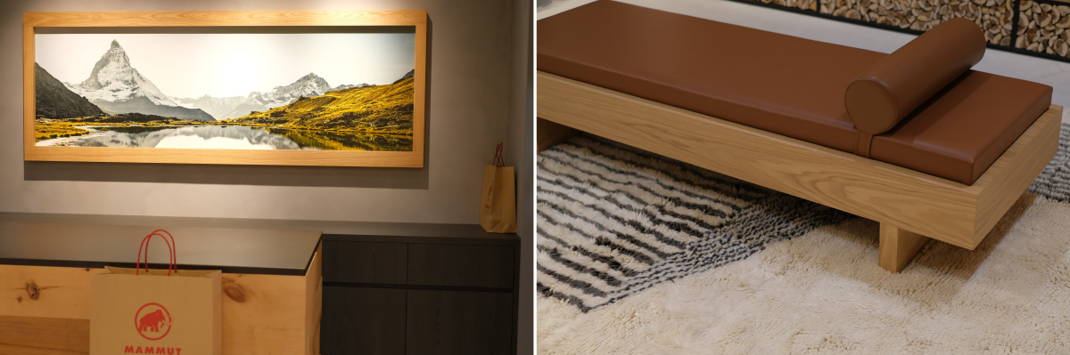 折しも、今年2024年は日本・スイス国交樹立160周年。それを記念すべくストアデザインがなされ、マッターホルン山麓のツェルマットや、アルペンリゾートのサンモリッツなどスイスのトップリゾート地でトレンドの「アルパイン・シック」が、この新店舗では表現されているのだ。