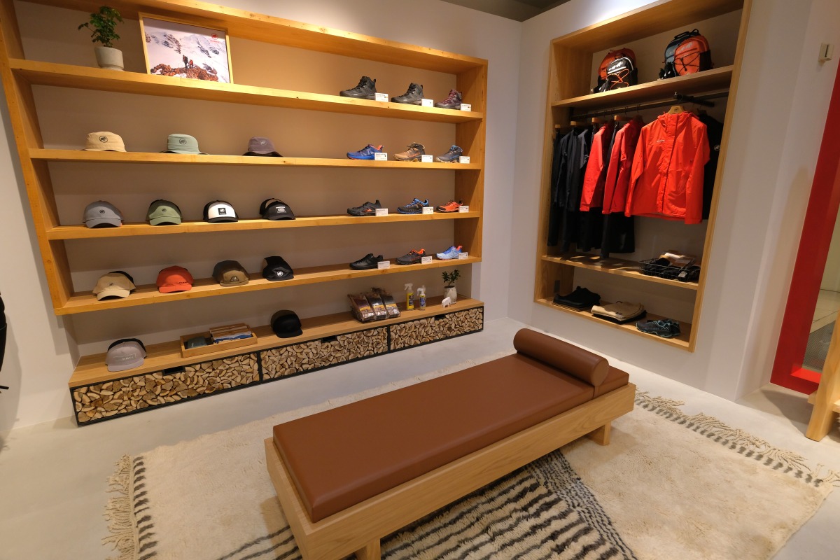 新店舗の面積は93.9㎡と、やや小ぶり。この点では、ブランド体験スペースである「ヒュッテ1862」を店内にもつ「マムート 京都」や、ボルダリングウォールを併設する「マムートストア 横浜」のような、スペースを必要とする仕掛けは難しい。