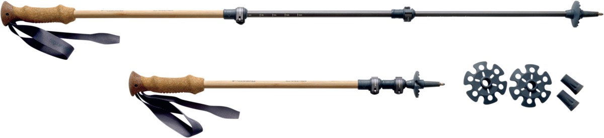 アルミシャフトにバンブーシートをあしらったナチュラルなデザイン。グリップ部分もコルク風素材で手触りがいい。長さ調節はレバーロック式を採用。スノーバスケットも付属。