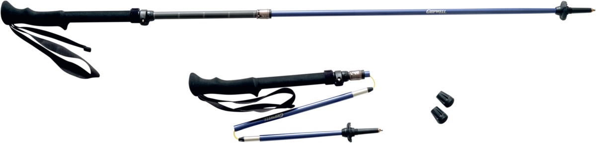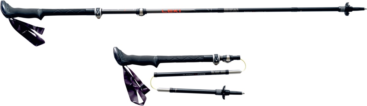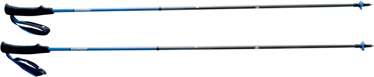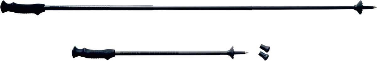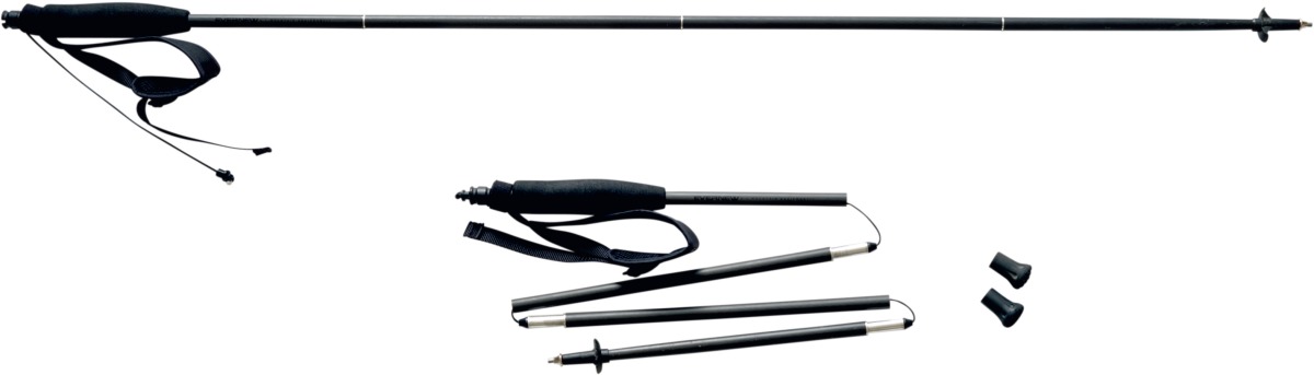 カーボン素材の超軽量ポール。長距離をグイグイと進むためにつくられたモデルでストラップは別売りで用意。かなり軽いがシャフトはしっかりした太さ。長さ調節はねじ込み式。