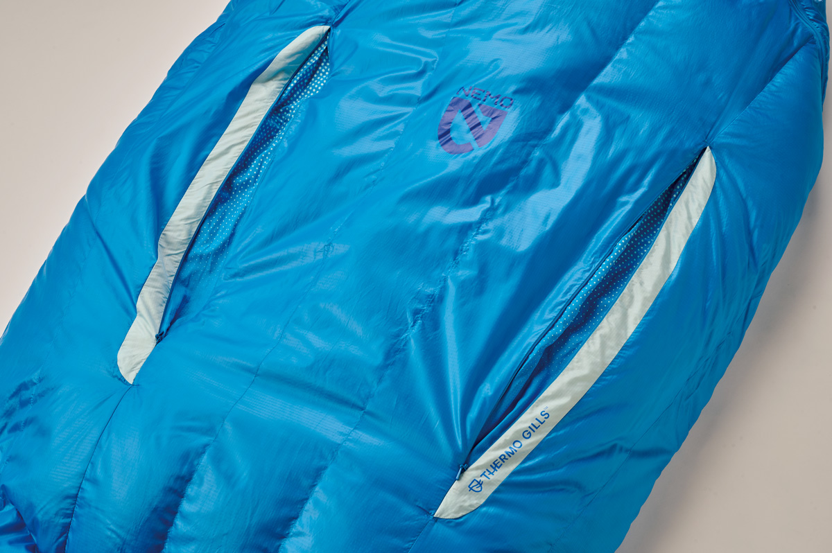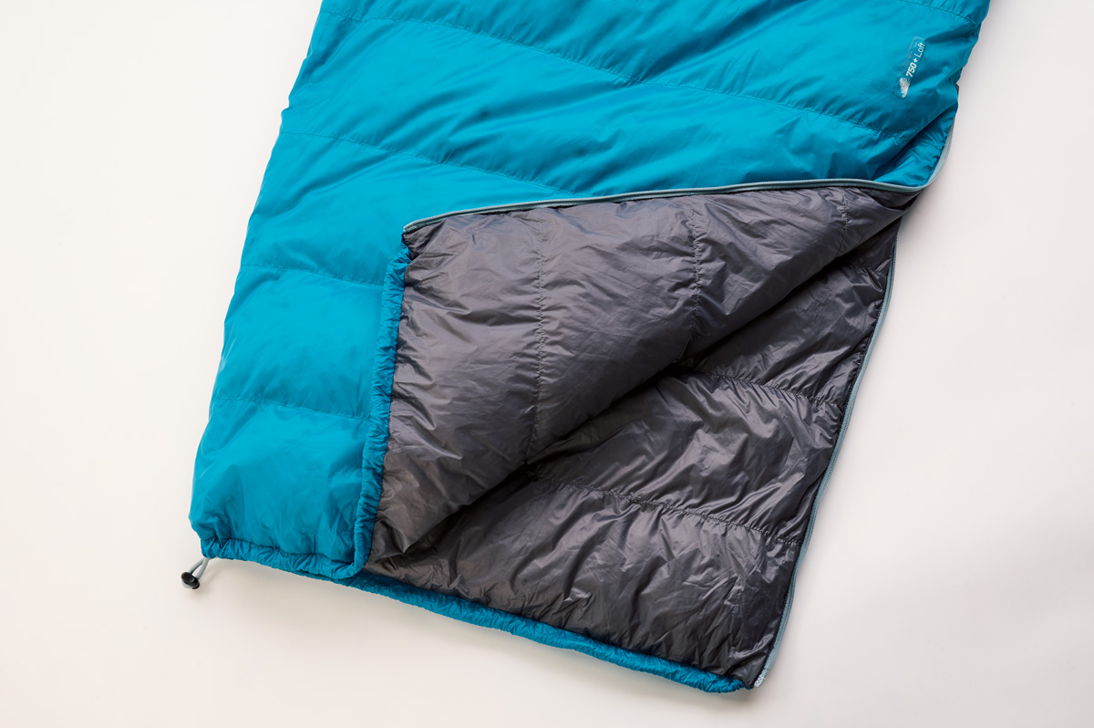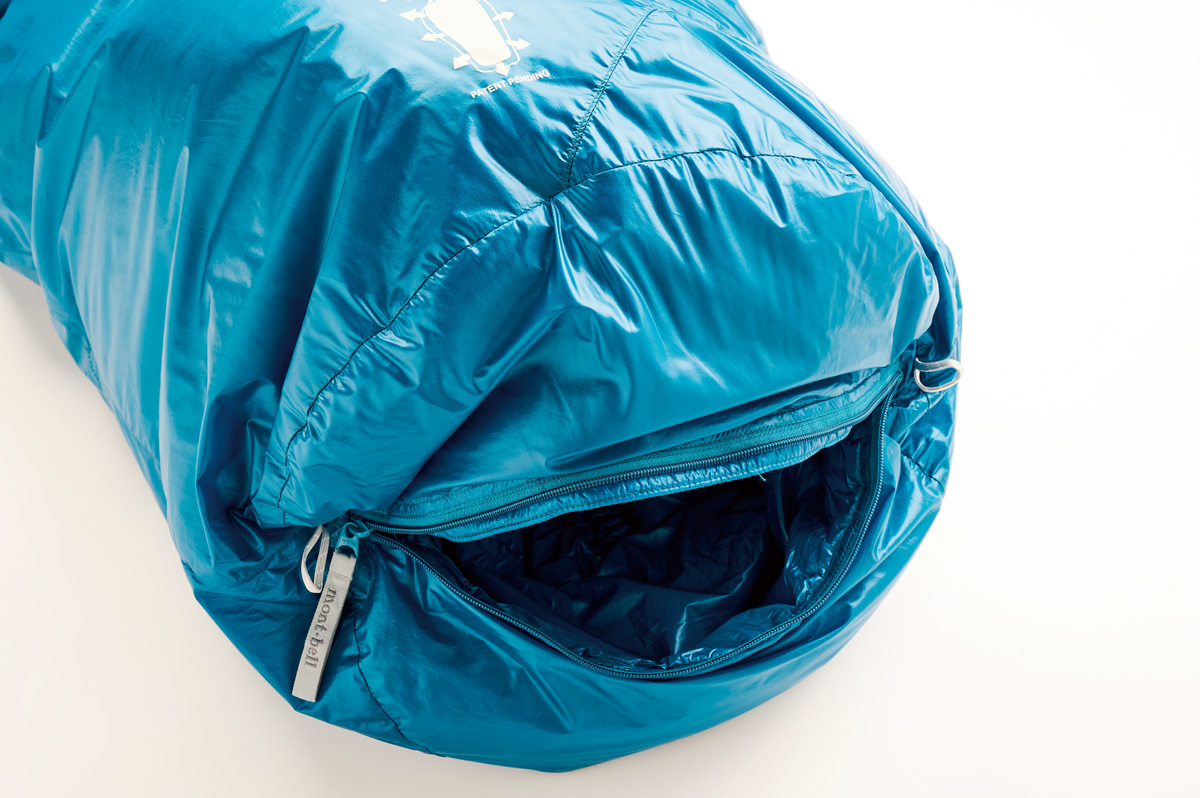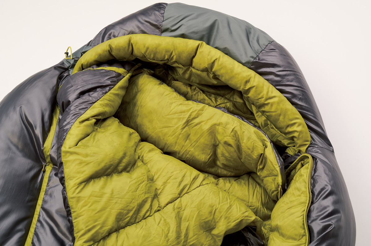 寝袋に使われる中綿としては最高品質の850+FPの撥水ダウン。上半身と下半身で方向を変えたバッフルで暖かさを増し、500gを下回る軽さなのに晩秋まで暖かく眠れる。頭部と足元は防水透湿性の生地で結露による濡れからダウンを守る。