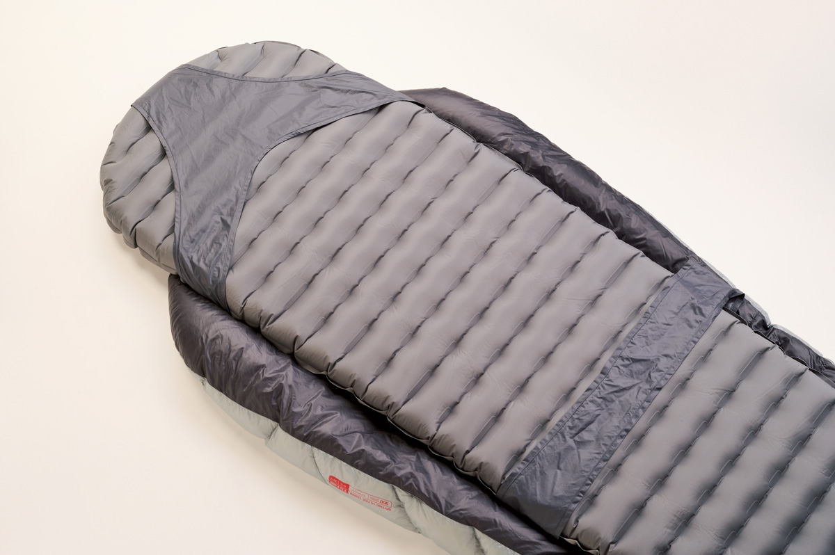 背中側にマットを固定できる仕組みで、断熱性はマットに託し、体の上にダウンを集中して使用。しかもダウンは少量でも非常に暖かい900FPの超高品質だ。そのために464gという軽さでも、初冬まで活躍する。