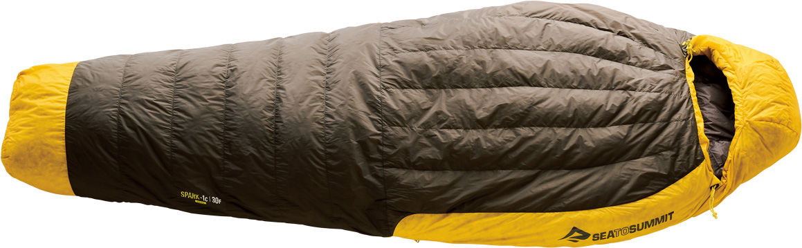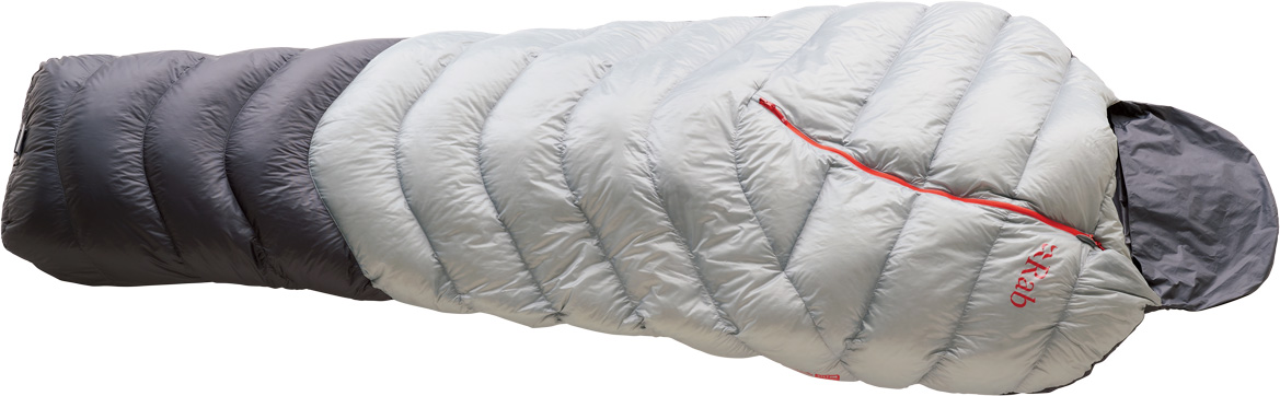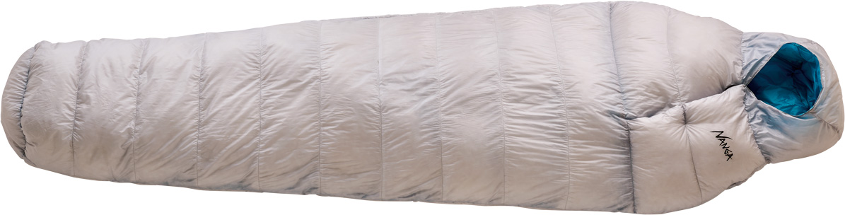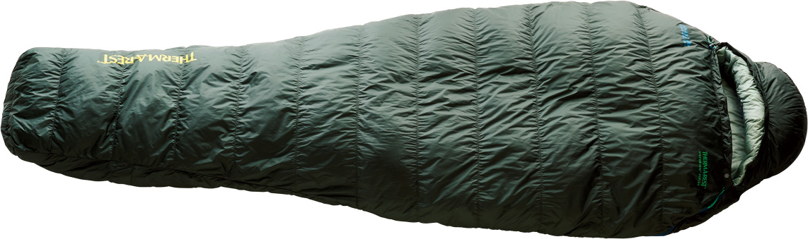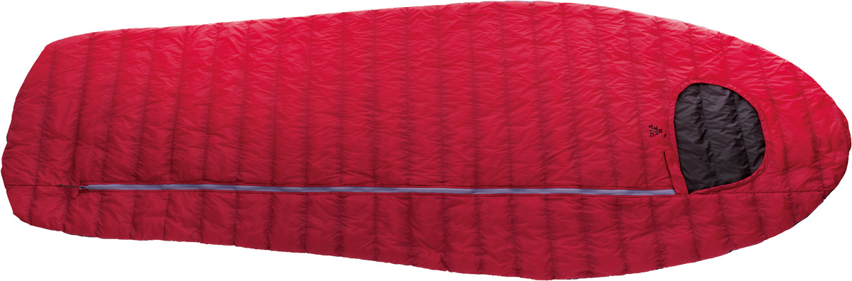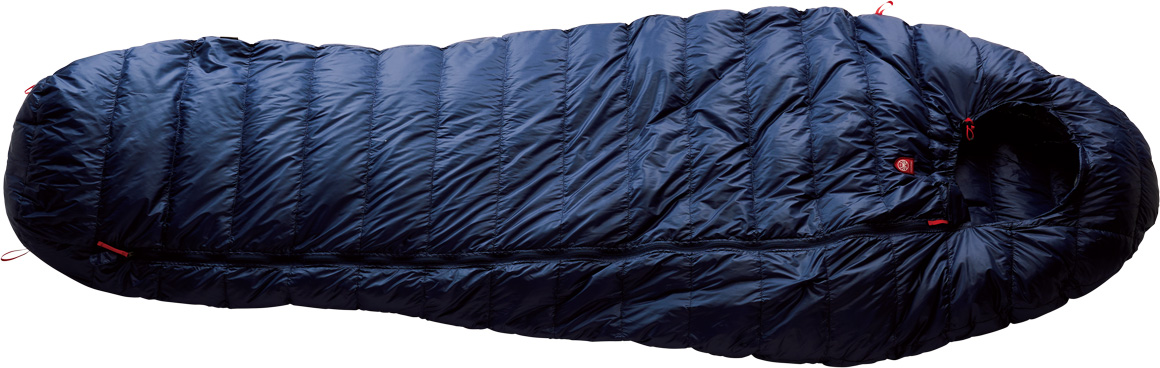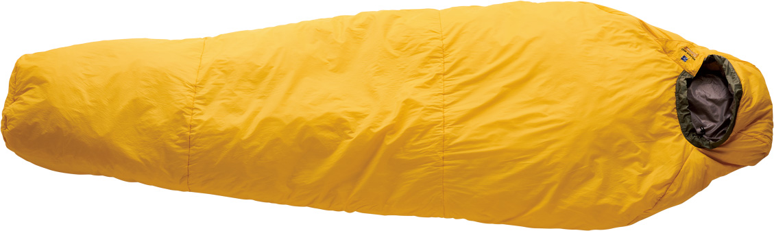 寝袋に使われる中綿としては最高品質の850+FPの撥水ダウン。上半身と下半身で方向を変えたバッフルで暖かさを増し、500gを下回る軽さなのに晩秋まで暖かく眠れる。頭部と足元は防水透湿性の生地で結露による濡れからダウンを守る。