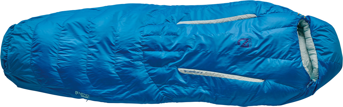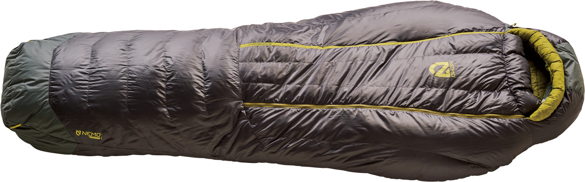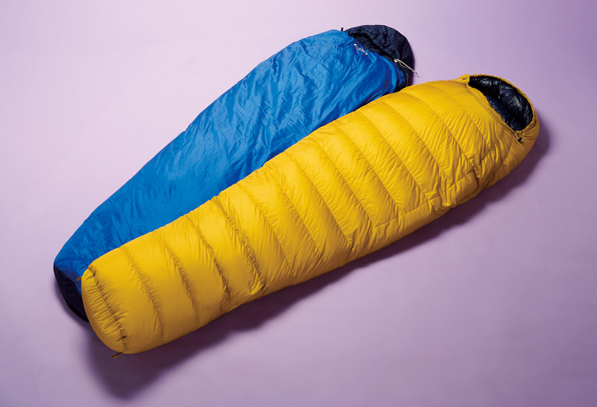 スリーピングバッグは中綿の種類によって大別される。そのメイン素材はダウンで重量のわりに暖かく、収納時はコンパクトだが、水濡れには弱く、少し高価だ。その点、化繊の中綿は安価で水濡れにも強いが、ダウンほどは暖かくなく、収納時はかさばる。現在はそれらのハイブリッドやダウンを模した化繊の中綿なども登場している。
