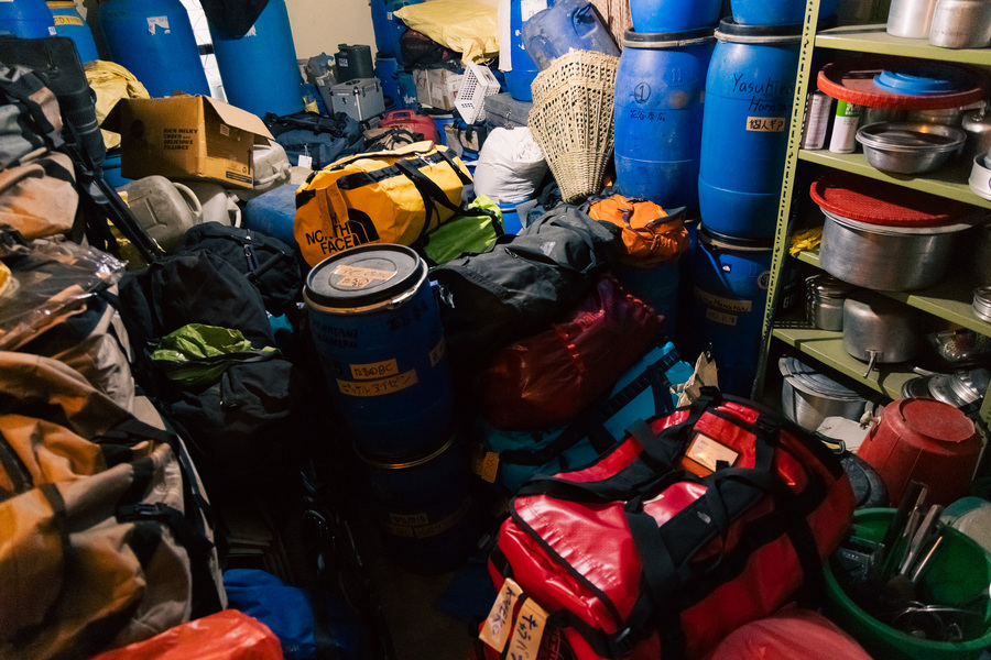 ネパールにあるヒマラヤキャンプのデポ装備にはテントや寝袋、登攀具、電装品などがある。ここではこの先のキャラバンで使うものと、ベースキャンプより上で使うもので荷物を振り分ける。
