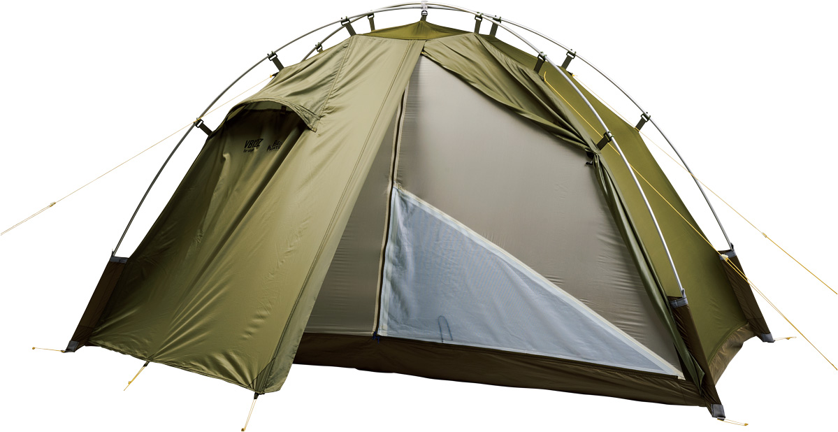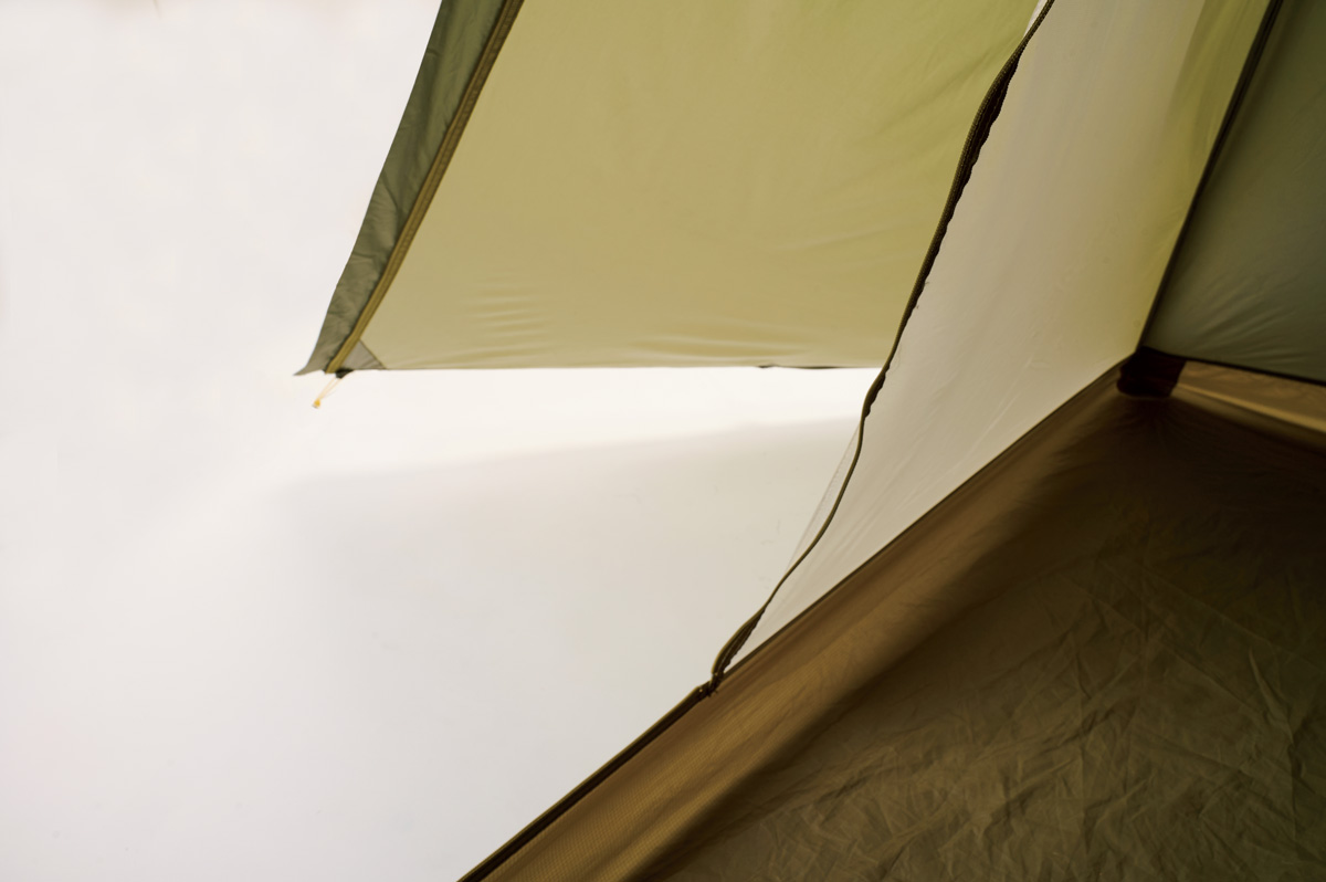 出入り口の前だけが2重になり、広い前室を持たせたシングルウォールテント。特殊な透湿防水素材のNanoventを使っていて、雨による濡れを避けながら、結露の発生を抑えている。