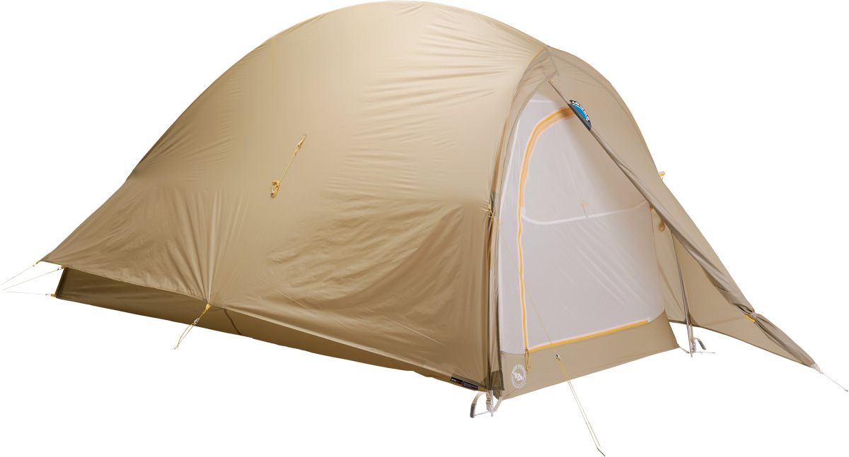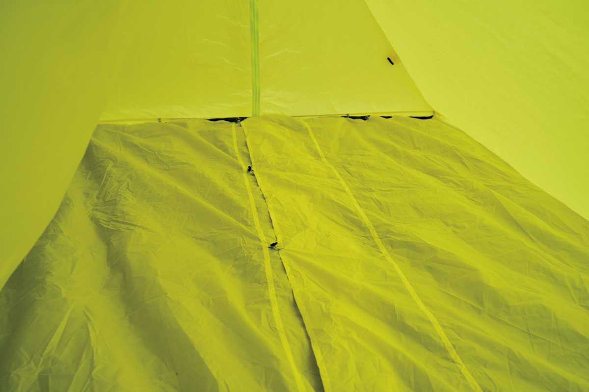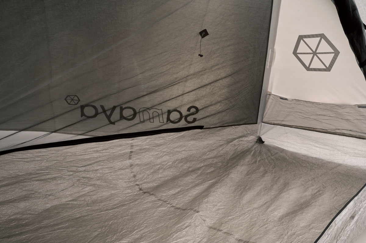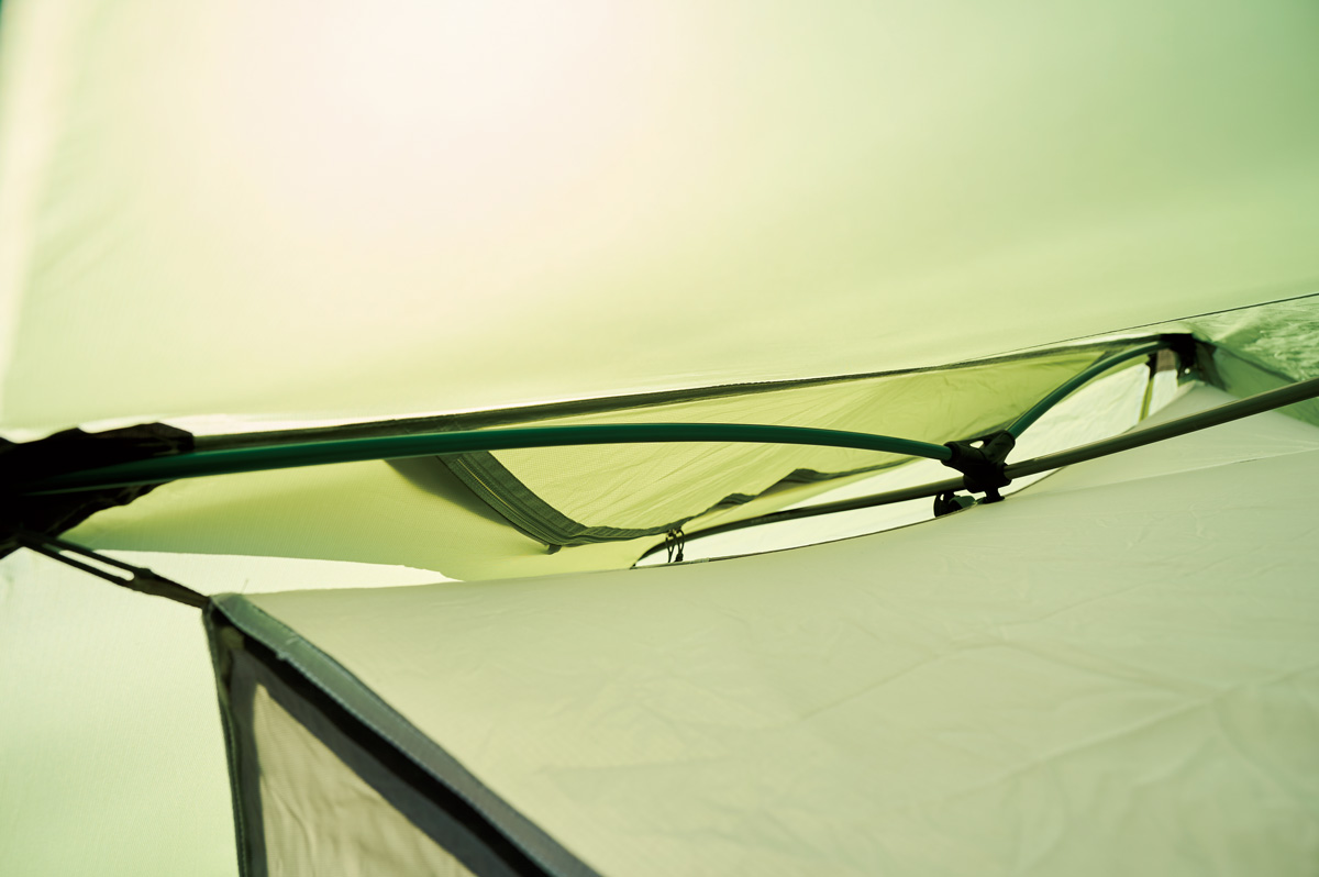 ふたつのハブで複数のポールを連結して垂直気味の壁を作り、広い内部スペースを実現。インナーテントの隅もバー状のパーツで立ち上がり、寝転んだときも頭部に余裕がある。ヘッドランプの光を拡散して明るさを増すライトバーが付属するなど、おもしろい工夫も多数。