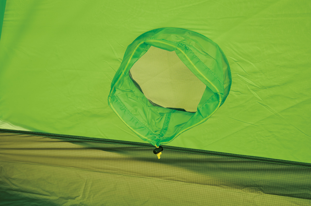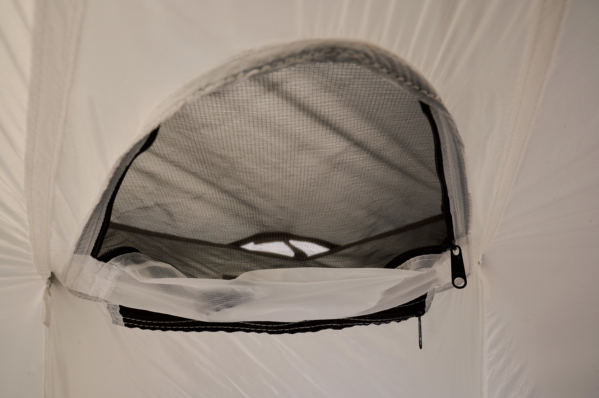インナーテントのスリーブにポールを通すだけで、すぐさま立体化。出入り口の上方と下方、さらにテント裏面と小型のベンチレーターが3カ所もあり、換気性は良好だ。フライシートのパネルを開けたときは面ファスナーで留めるだけというディテールもユニークである。