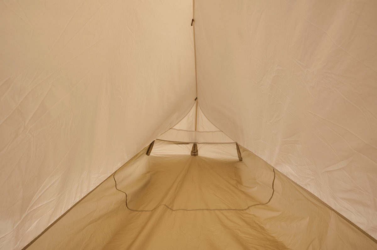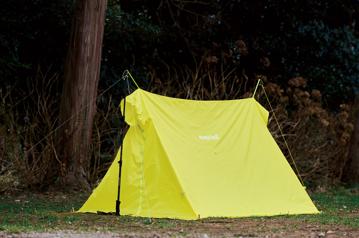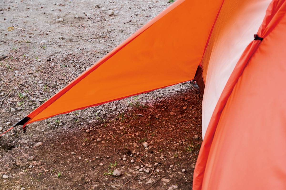 内部スペースは長方形で、その対角線に1本のポールを通し、あとはボトムの数カ所にペグを打つだけ。地面にしっかりと固定して立体化すれば強風を受け流し、悪天候にも十分に対応できる。本体の素材は耐水圧が高く、透湿性にも優れており、結露が少ない。