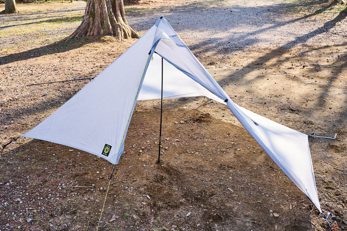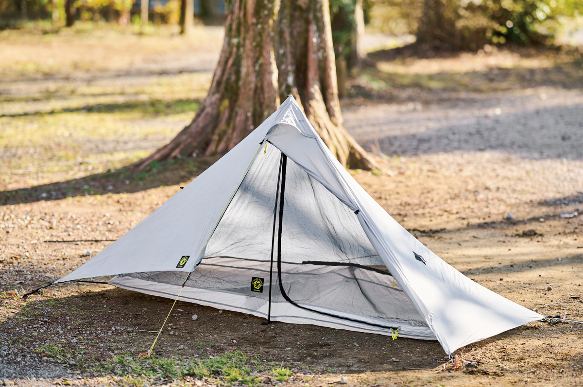400gの防水生地のタープと300gのメッシュテントのセット。虫の多い時期は組み合わせて、開放的に眠りたいときはタープのみでと、状況や気分に合わせて使える。タープの出入り口のパネルにガイラインをかけて広げると、広い前室のようなスペースができて便利だ。