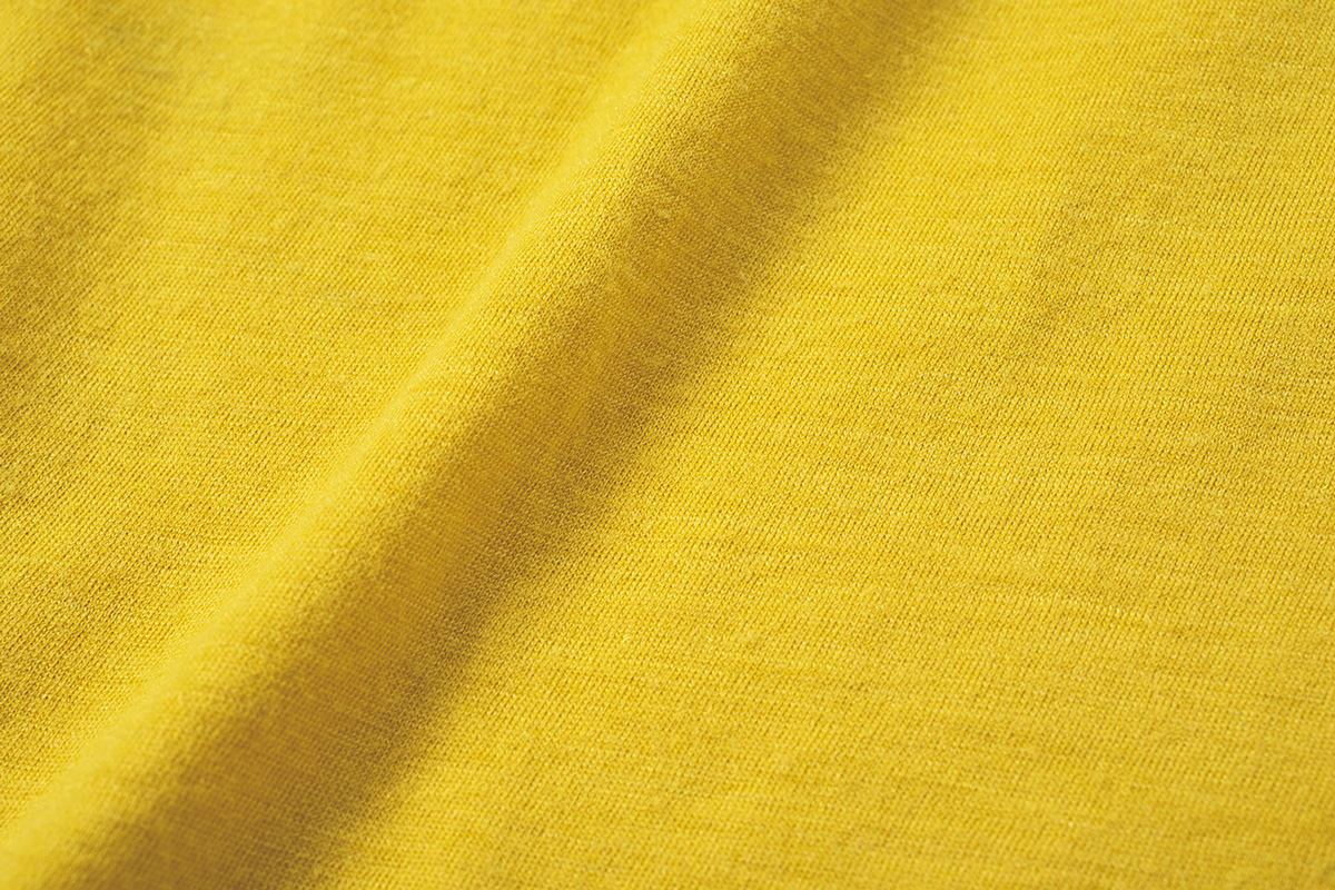 ナイロンにメリノウールとテンセルをツイストさせるように絡めることで、素材の機能や風合いを最大限に引き出す素材ニューヤーンを採用。涼やかな肌触りや吸汗性、調湿性、防臭性など多機能を備えたベーシックかつハイテクな一枚。
