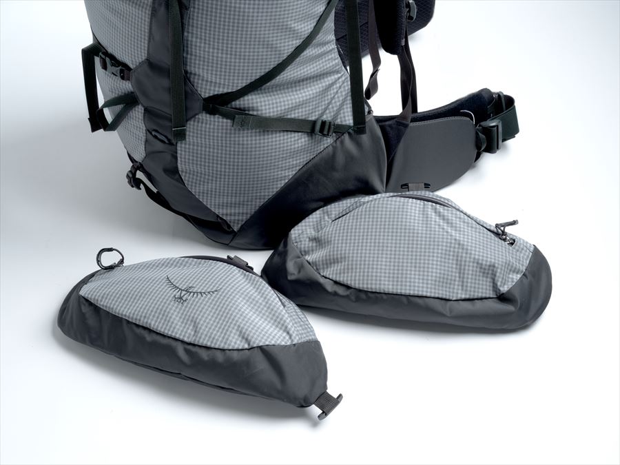 これらをすべて外していくとすると、左右のサイドポケットで100g、ヒップベルトで200g、雨蓋で200g、合計500gもの軽量化になる。デフォルト状態だと重量は2kg強あるが、2kgを大きく切る軽量な大型バックパックにカスタマイズすることが可能だ。