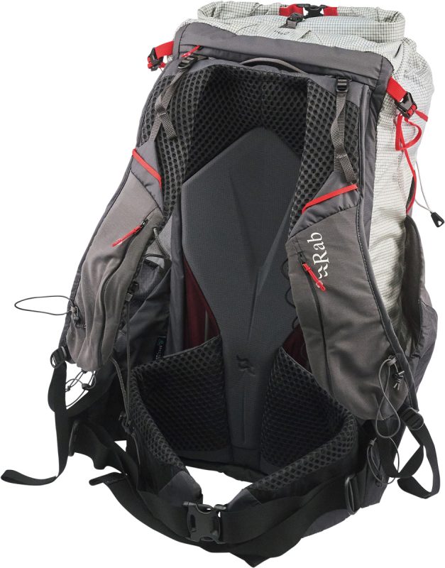 12㎏程度の重さを背負うので、荷重分散に機能するフレームを装備。しかしスタンダードなバックパックのような強い剛性のフレームは重量が増えるうえに、動きを制限する。だから軽量で柔軟なフレームがいい。ショルダーハーネスや背面にはパッドを装備。ソフトな背負い心地で身体になじみ、疲労を軽減。