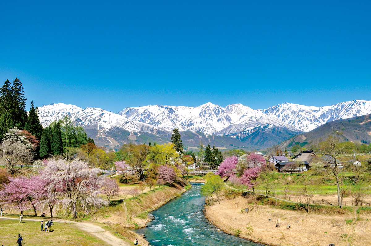 地元住民らと白馬村が協力してつくりあげた公園。白馬駅から徒歩で約15分と、歩いていける範囲にあるのはうれしい。白馬村を源流とした姫川にかかる大出吊橋や茅葺き屋根の古民家越しに、白馬三山の山並みが美しくそびえる絶景スポット。春には山の残雪と、公園の桜のコントラストが楽しめる。