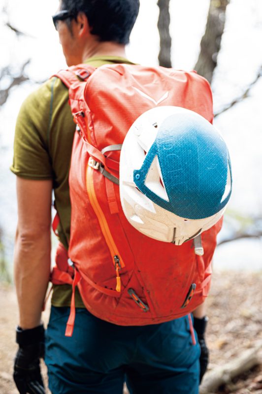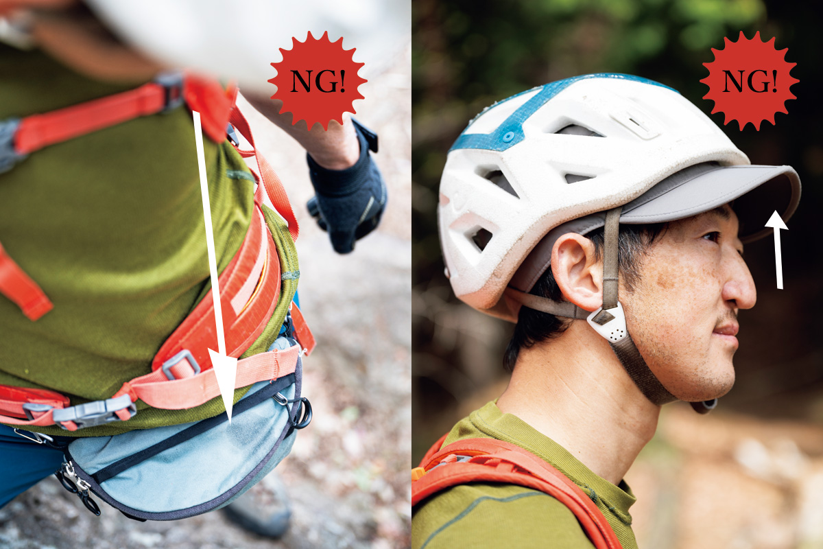 岩稜帯を登る際は、手がかり、足がかりを目視できることが重要だ。キャップやウエストポーチを身に着けていると、それだけで見上げたときや足元の視界が狭まってしまい、危険を伴うこともあるので装備は極力シンプルに