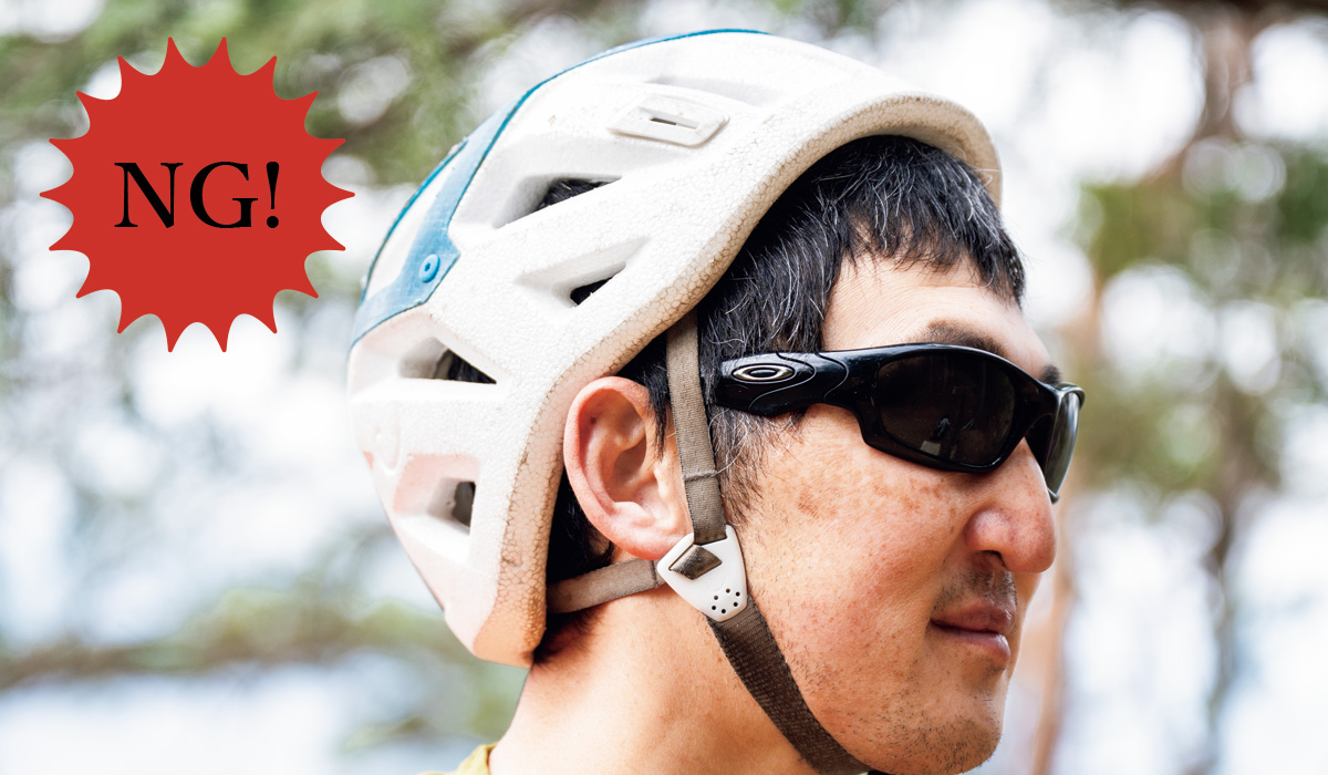 被り方のNG例。よく見かけるのが後傾気味になり、おでこが出すぎてしまっている被り方。頭に対して垂直に被り、あご紐もきちんと留めること。