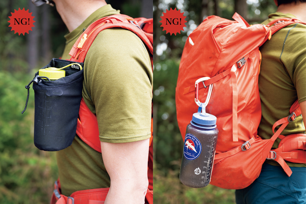 ドリンクボトルやカメラなどの小物をカラビナやドリンクホルダーなどで外付けするのは岩稜帯では避けたい。登る際に自身の障害になるばかりか、小物が岩に当たって落としてしまうこともあり、周囲の人にも迷惑がかかる。