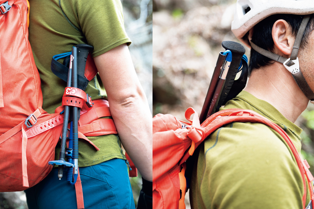 岩稜帯に入る前にトレッキングポールは収納すること。その際にゴムバンドがあると、バックパックのウエストベルトに装着できて便利。折りたたみ式でコンパクトになるものを選ぶ。パックと背中の間に差し込む方法も有効だ。