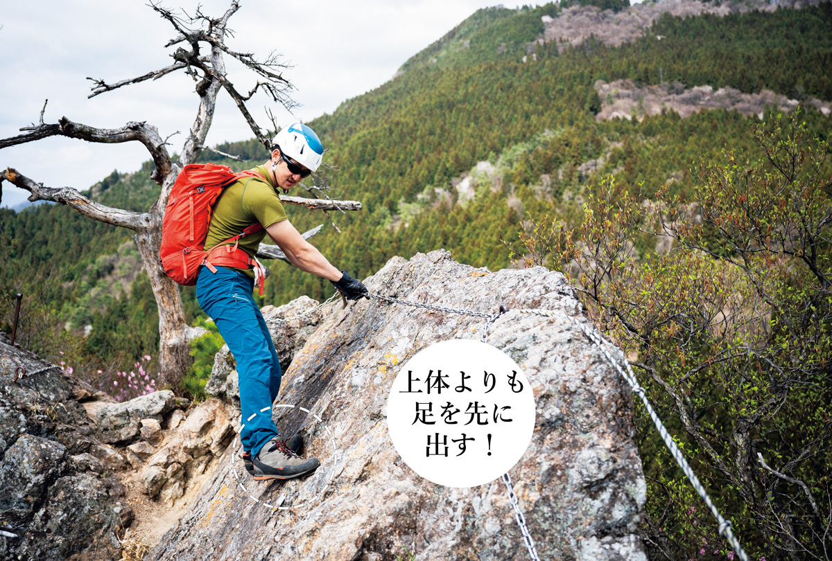 トラバースするときも、基本は三点支持の態勢で。上体を起こし、岩に上半身が近づきすぎないようにする。手を出すよりも足を先行させ、徐々に重心移動させる。山側の足は進行方向に向け、シューズのエッジを効かせる。谷側の足の爪先はやや開く。