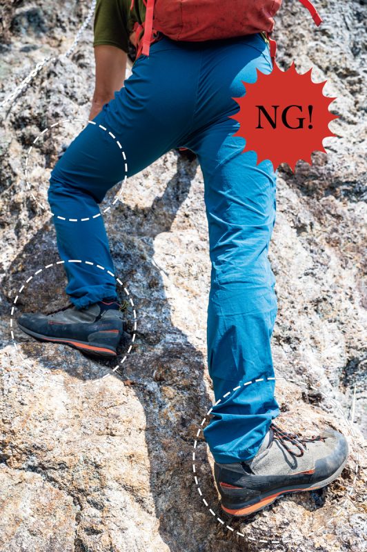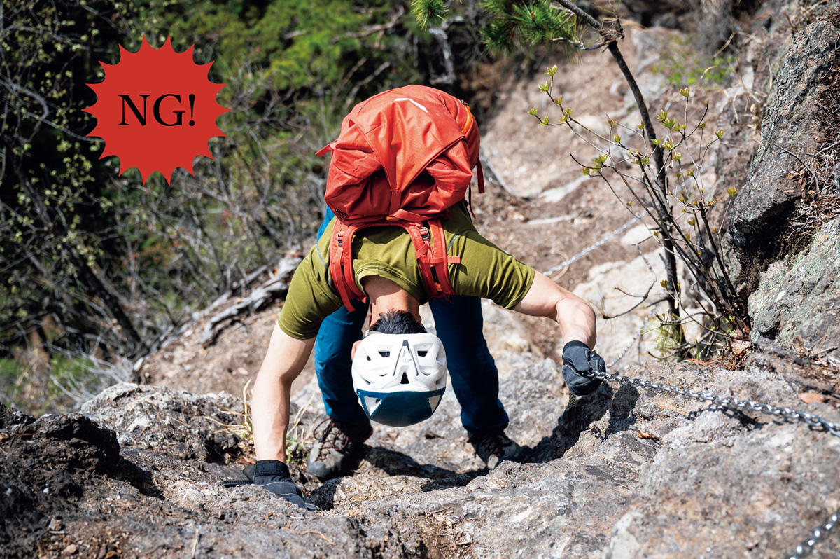 岩稜帯エリアはほかの登山道とは異なり、危険度が増すため、安全な場所で身支度を整えてから向かうようにしたい。テントやマット、ドリンクボトルなど、バックパックに外付けしているものがあれば中にしまい、靴紐がほどけないようにしっかりと結ぶ。ヘルメットを正しく装着する。陽射しが強ければ、キャップではなくサングラスをかけるようにする。服装は、足さばきがよく動きやすいタイトめな服装が理想で、足まわりの快適さを意識しよう。
