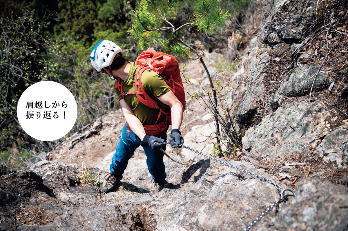 岩場からなるべく上体を離し、足元を見ながらうしろ向きに下る。怖いからと岩場にへばりつくと足元が見えなくなるうえ、身動きが取りづらい。足場を確認するときは肩越しからうしろに振り返り、たしかめる。いい足場を見つけたら、少しずつ重心移動させる