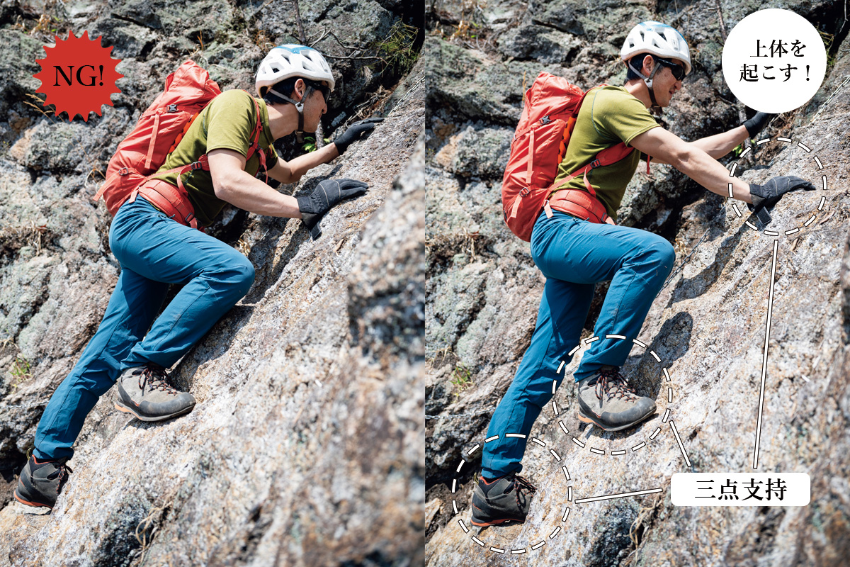 岩場を登るときは三点支持の姿勢が基本だ。手足4本のうち3本で身体を支え、残る1本で次の一手へと移動する。そのときの姿勢は上半身を起こし、壁に身体を近づけないこと。あまり腕の力に頼らず足で立ちこみながら、三点支持で重心のバランスを保つ。足幅は広げすぎず、高く上げすぎないように。