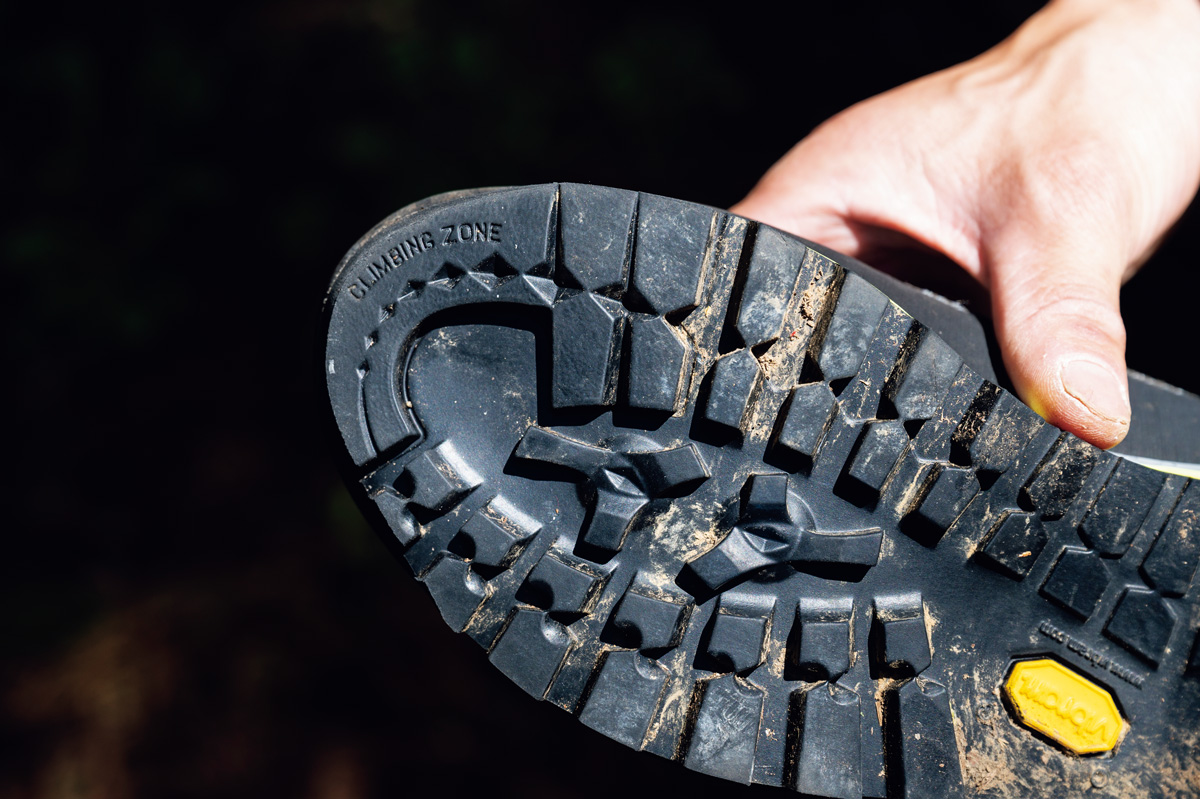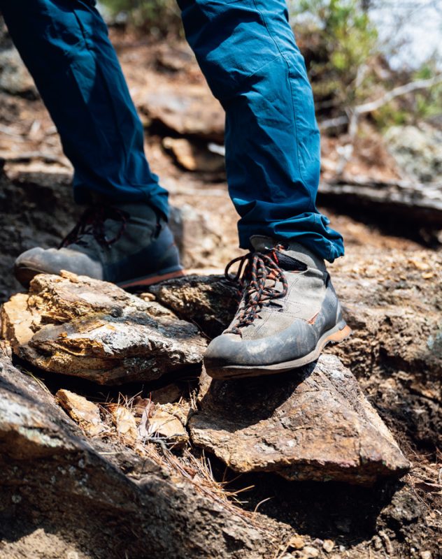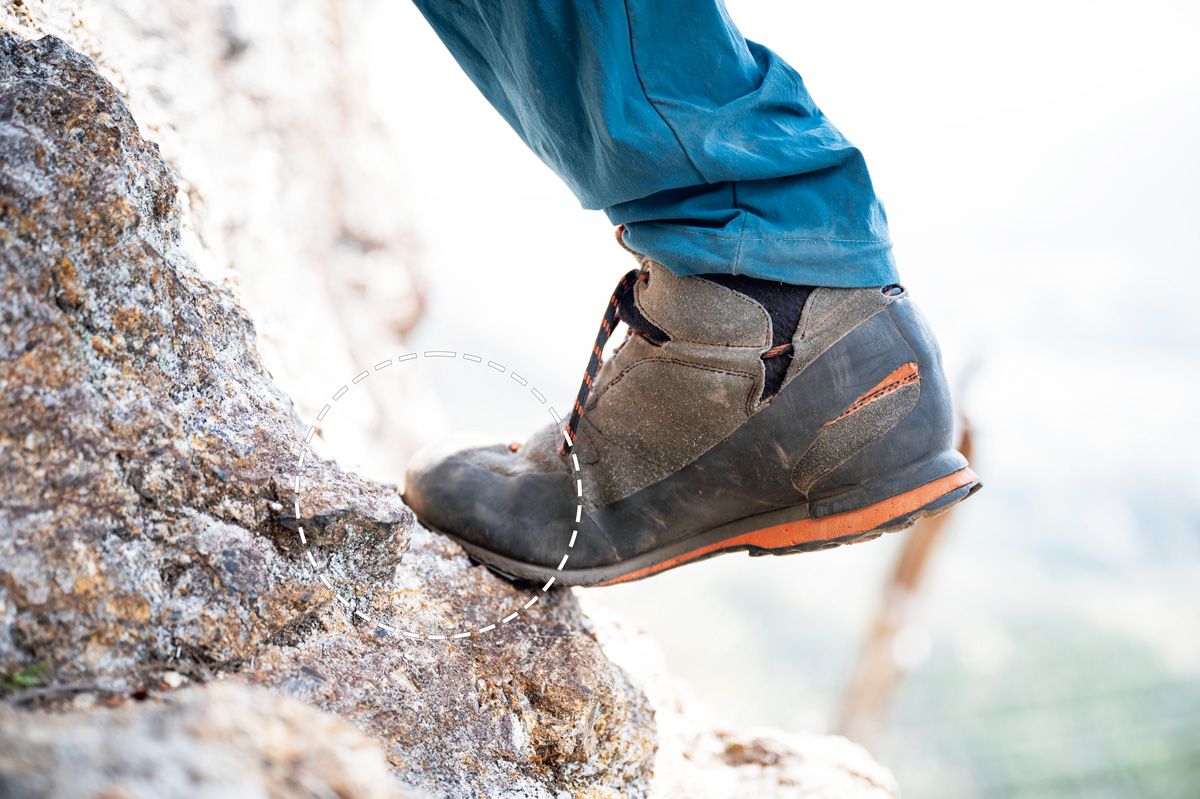 岩稜歩きの際は岩に立ちこんだときに滑りにくく、グリップ力がある、ソールの爪先部分に「クライミングゾーン」があるものを選びたい。縦走の場合はミッド~ハイカットのシューズを選ぶといい。
