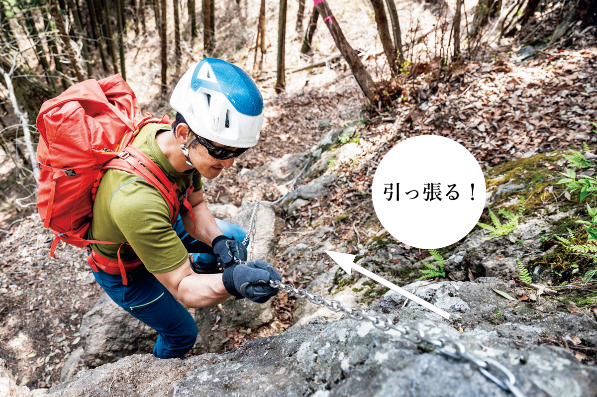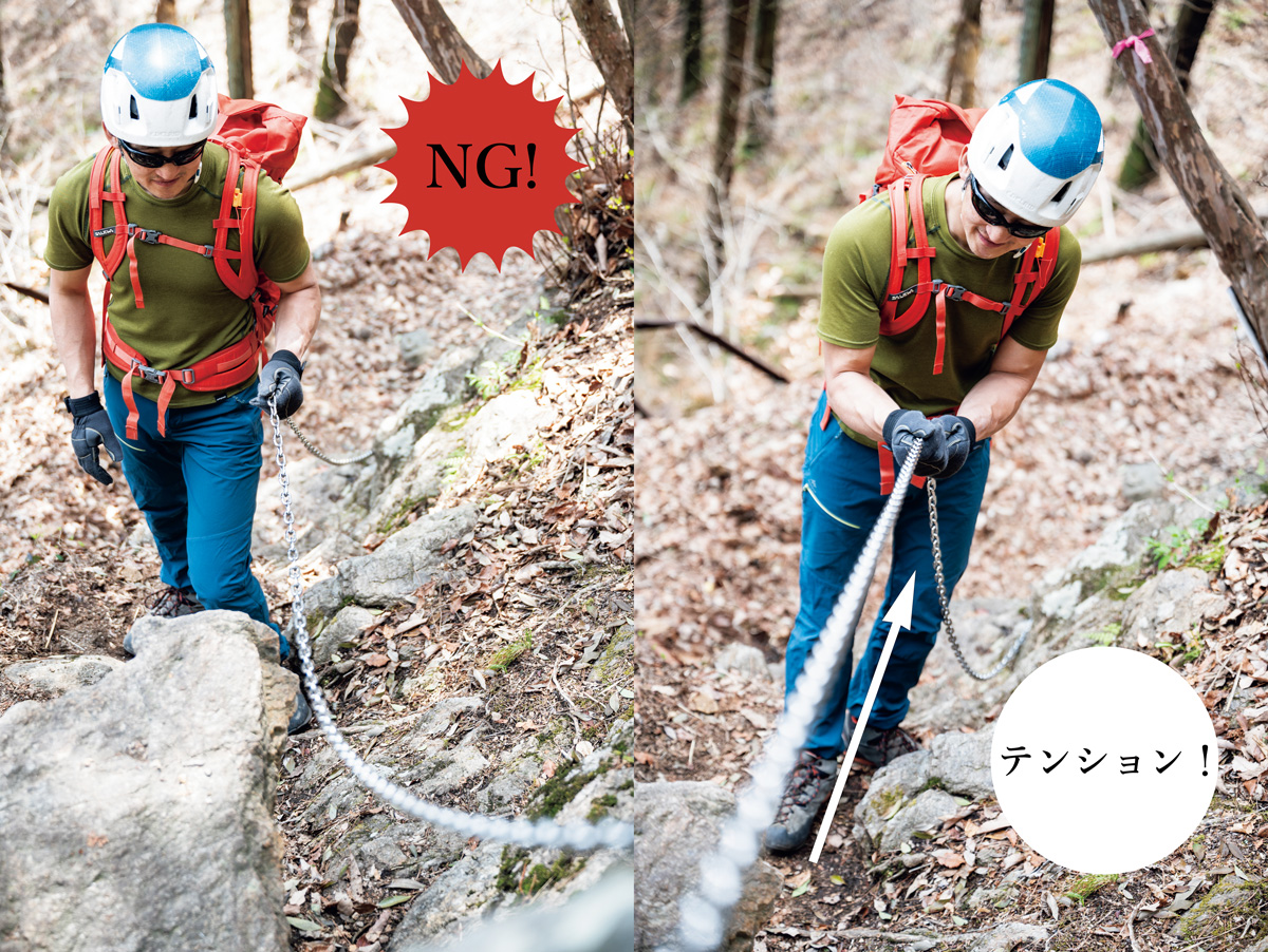 クサリ場ではさまざまな状態のものがあるが、ときにはダルダルに弛んでしまっているクサリもある。そんなときは完全にクサリに頼ってしまうと振られてしまうので、補助程度に使うように心がけよう。手前を弛ませないように、軽く引きながら、真下にテンションをかけるようにする。崖側には身体の重心が流れていかないように注意する。