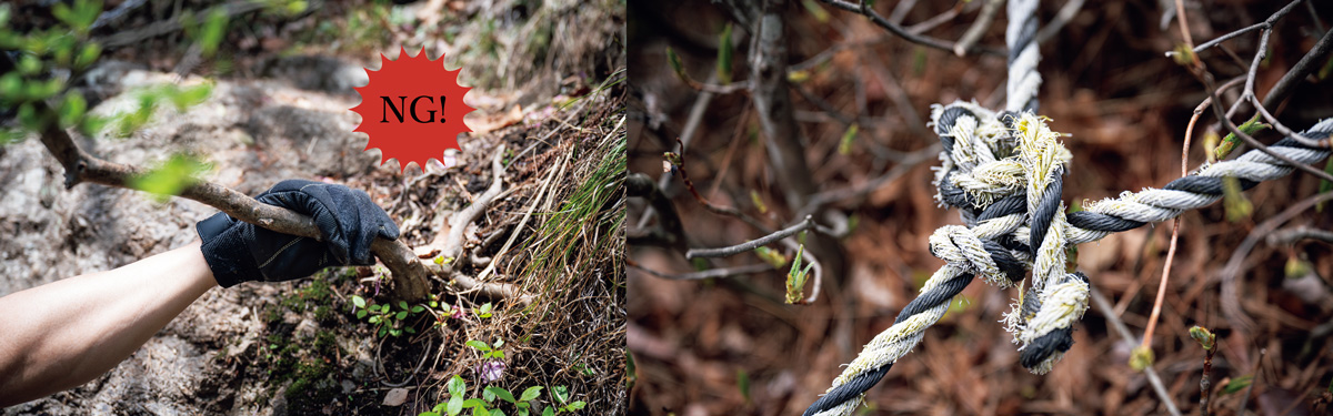 ほかにも信用してはいけない手がかりがある。劣化したロープは代表例で、いかにも摩耗しているものは頼りにしないほうがいい。木の枝を使う際も、目視とテストにより安全性をたしかめよう。