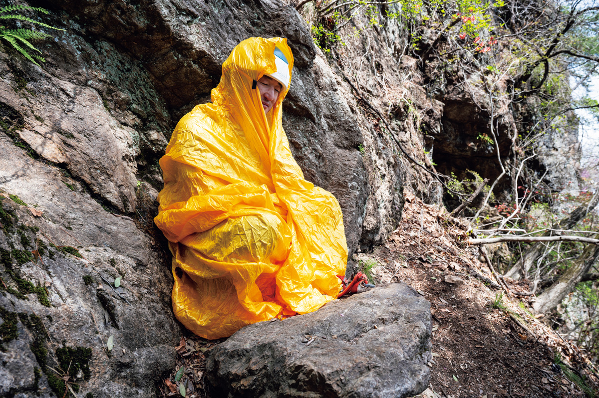 岩稜帯で急な雷雨に遭ってしまったとき、逃げ場がないときはひとまず停滞するしかない。濡れた岩は滑るので慌てずに、雨宿りできるようなハング状の場所を探し、ツエルトに包まってやりすごす。
