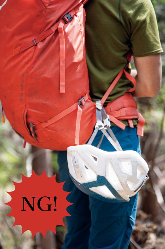 NG携行例。ヘルメットを固定させずにぶらぶらさせないこと。登山中の障害となり、事故につながりかねないし、ほかの登山者の迷惑になる。
