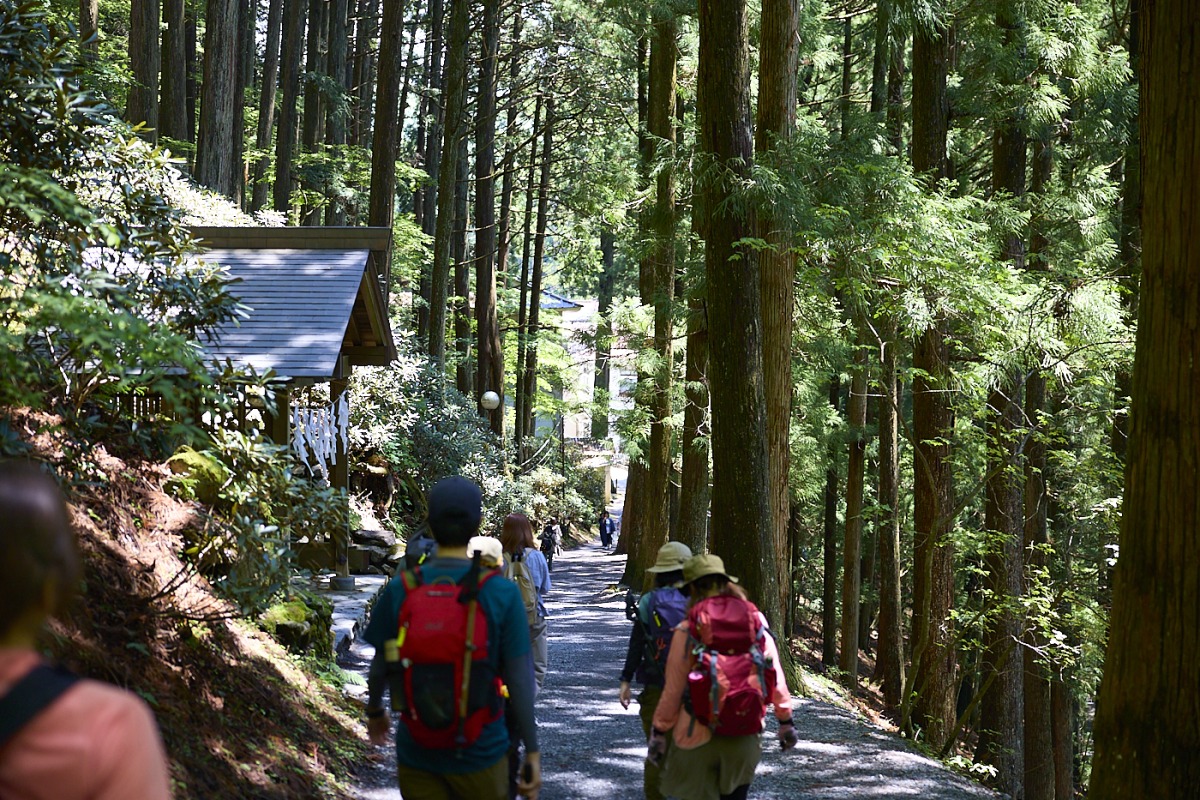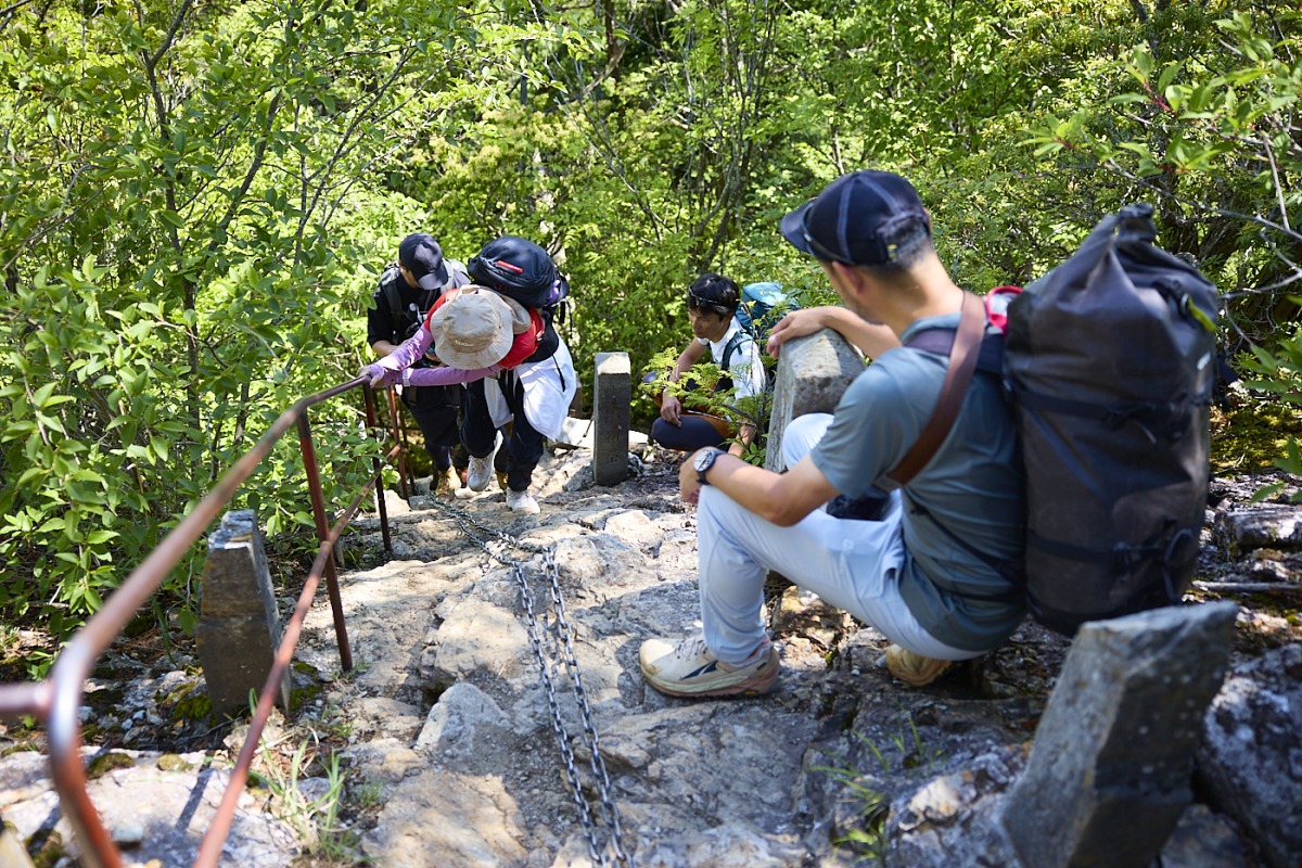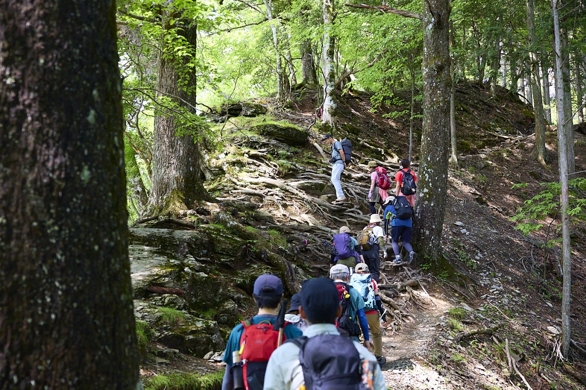 木漏れ日もあまり届かなくなるほどの木々に囲まれたなか、木の根を踏み越えたり、急登すぎて階段が整備されていたり、鎖場があったり。大内さんのお話、神社仏閣の歴史やイザナミとイザナギの神話、三峯神社のオオカミ信仰などを思い出し、歴史と信仰が息づくその道を進んでいきました。