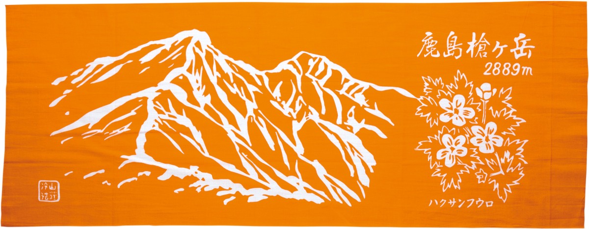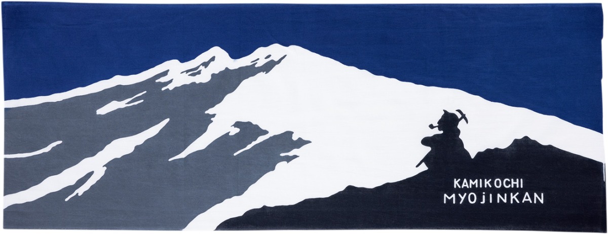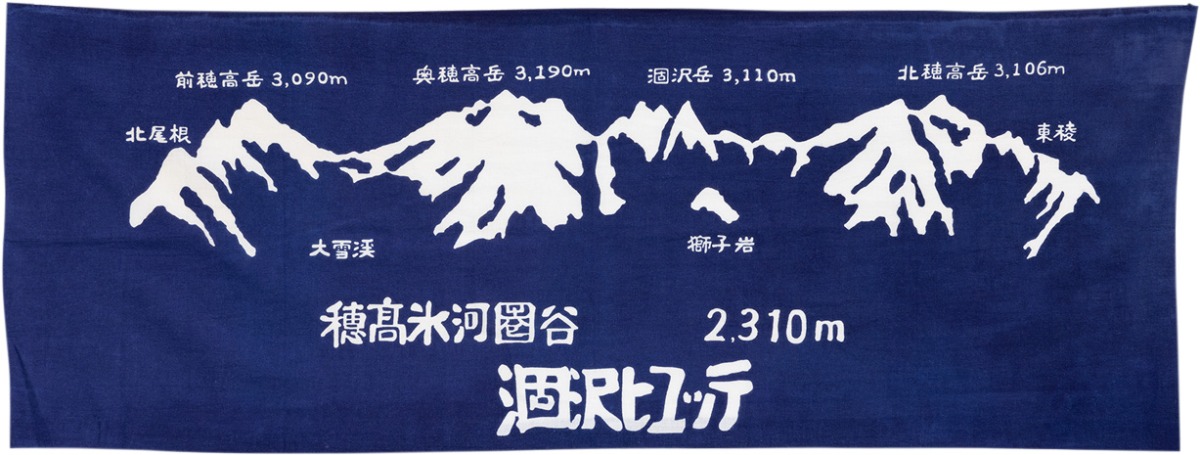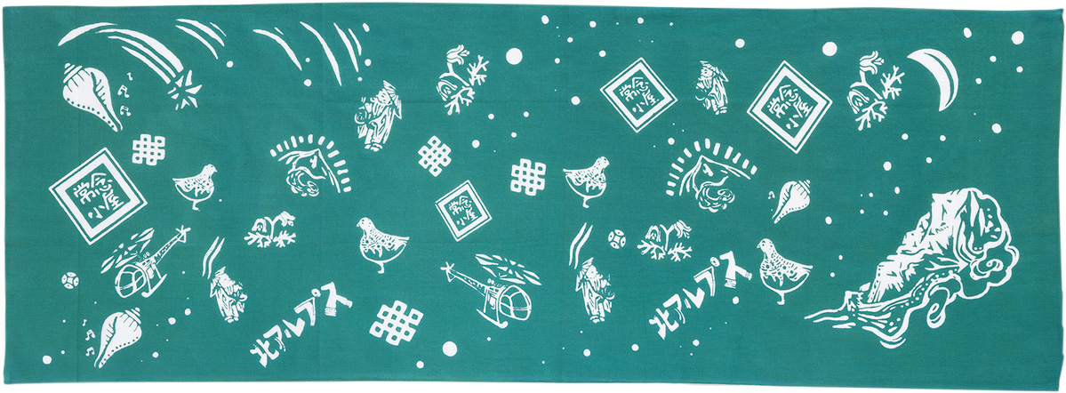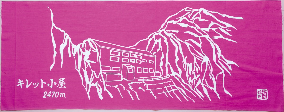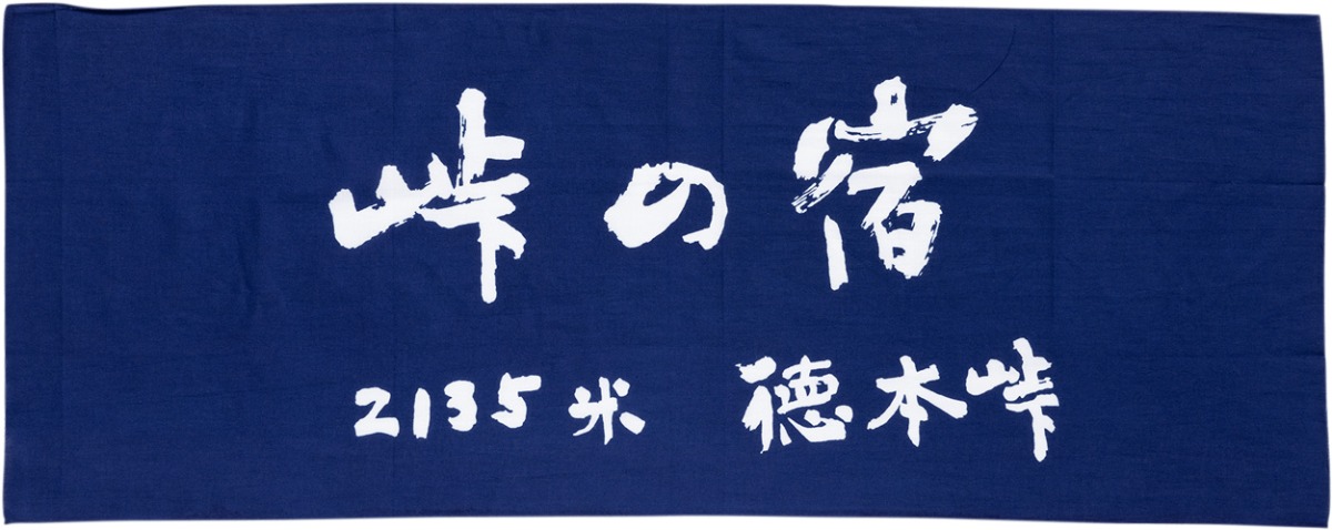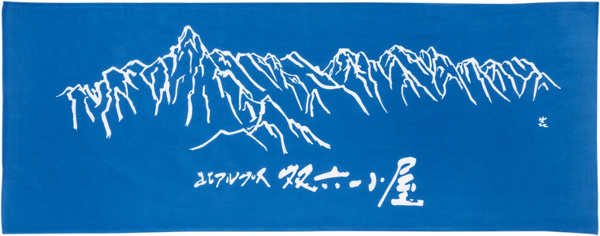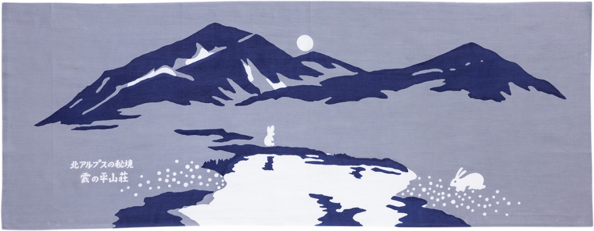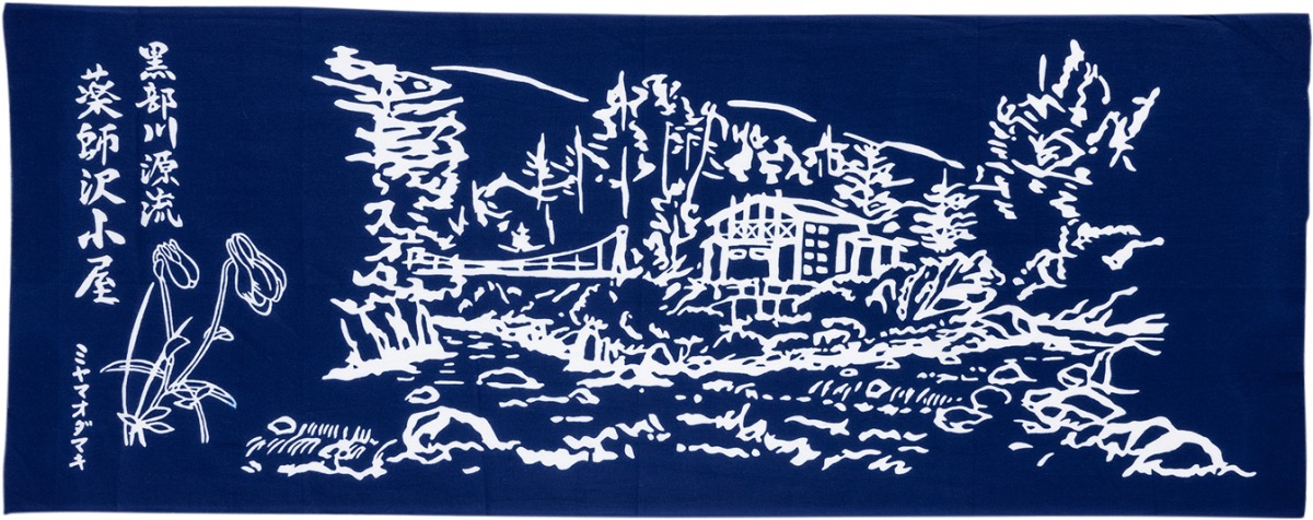 水晶岳の麓に湧く天然温泉を有する小屋。手ぬぐいは露天風呂からの眺望をイメージ。