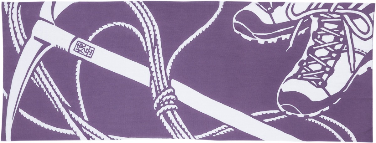 登山に必要なさまざまな道具を散らしたポップなデザインの手ぬぐい。