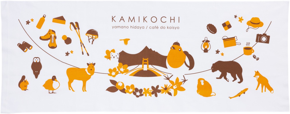 カモシカやコマドリなど上高地にちなんだ動植物が愛らしく描かれている。