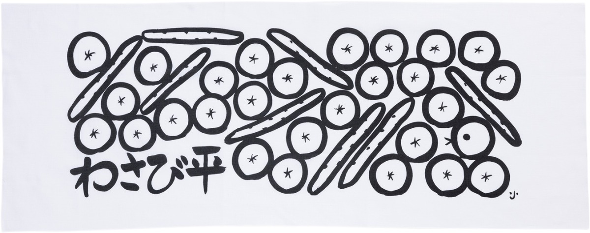 穂高の水が集まるわさび平の冷たい水で冷やしたトマトときゅうりがモチーフ。