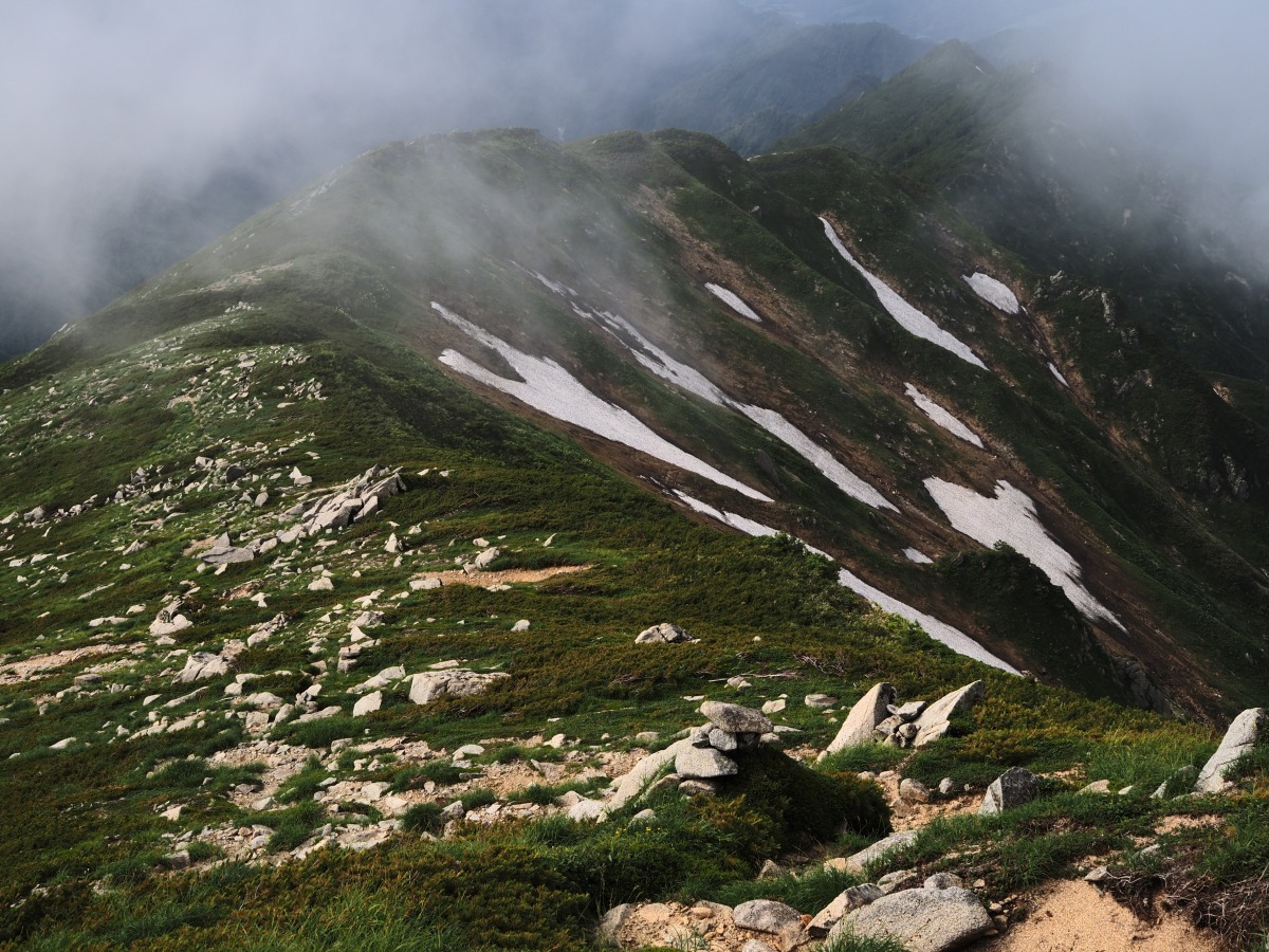稜線や見通しのいい登山道も絵になります。こちらの山の写真は、手前から奥に向かって稜線の繋がりが逆S字を描いています。このようにS字やC字など、構図を整えるとバランスのいい写真に仕上がります。