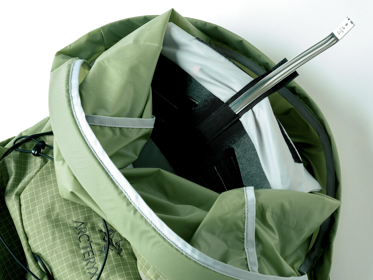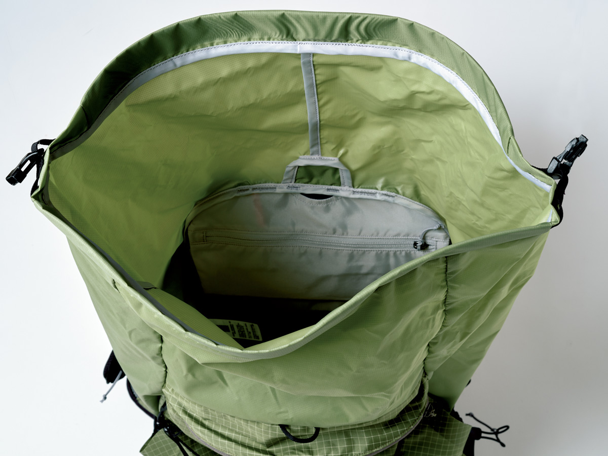 次に、メインのアクセスをパネルオープンからロールトップに変更。これによって荷物の多少に関わらず、しっかり抑えの効いたパッキングができるようになった。基本的にサイドコンプレッションを持たないライトウェイトパックにとって、トップから絞り込むように締められるのは意外と重要な点だ。