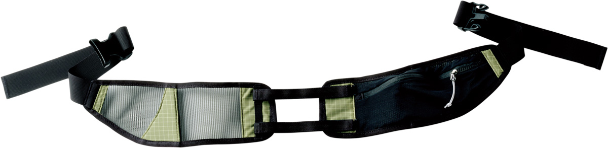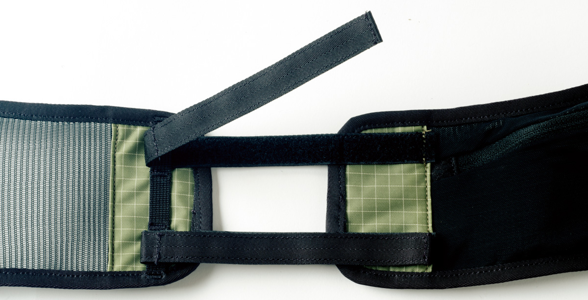 ショルダーストラップと同様、ヒップハーネスを取り外して調整可能。ウエストサイズの違いに関わらず、背面のベルクロ留めを変えることでサイドポケットを適切な位置にフィットさせ、バックル引き手部分の過不足も調整できる。