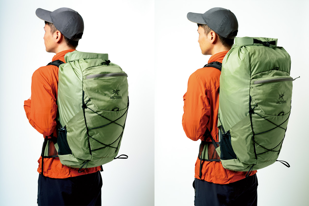 容量変化に対して容易に対応できる点がロールトップデザインの大きなメリット。左が通常の35ℓで、右が45ℓまで詰めた状態。10ℓをプラスしても背負い心地やバランス感に違和感はなく、見た目にも大きく変わらないことがわかる。