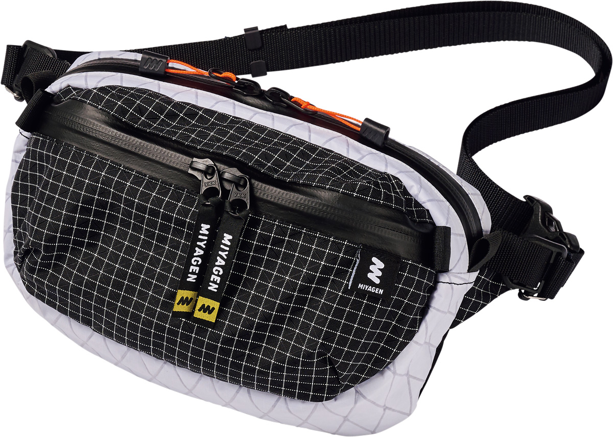 ただ軽いだけでなく、軽く使える独自のアイデアが光る東京・神楽坂に工房のあるガレージブランド。このファニーパックは、本体にストレッチ素材を採用。腰に巻くことで広い開口部が自然に締まり、収納物の脱落を防ぐ。腰巻型サコッシュとも表現できるが、サコッシュ型ファニーパックと呼ぶのが使い勝手に近い。バックパックのウエストハーネスとも干渉せず、違和感もなく、ジャケットの裾下に装着できるのが、いい!