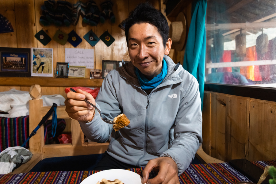 そうこうしているうちに大きな村が見えてきた。グンサだ。今回のキャラバンのなかではもっとも大きな村だ。ヘリポートや診療所もある。なかでもおどろいたのは宿泊予定のロッジだ。電気が引かれていて部屋にトイレもついている。食堂ではケーキやコーヒー各種が取り揃えられていた。ひさびさの甘い誘惑には勝てず、みんなで注文してしまった。 まさか標高3,000mを超えた奥地で素敵なコーヒータイムが取れるとは思ってもみなかった。体調に不安のあった金子君も元気そうにケーキをほおばっていた。いや、いま思うと元気そうに見えていただけだったのかもしれない……。