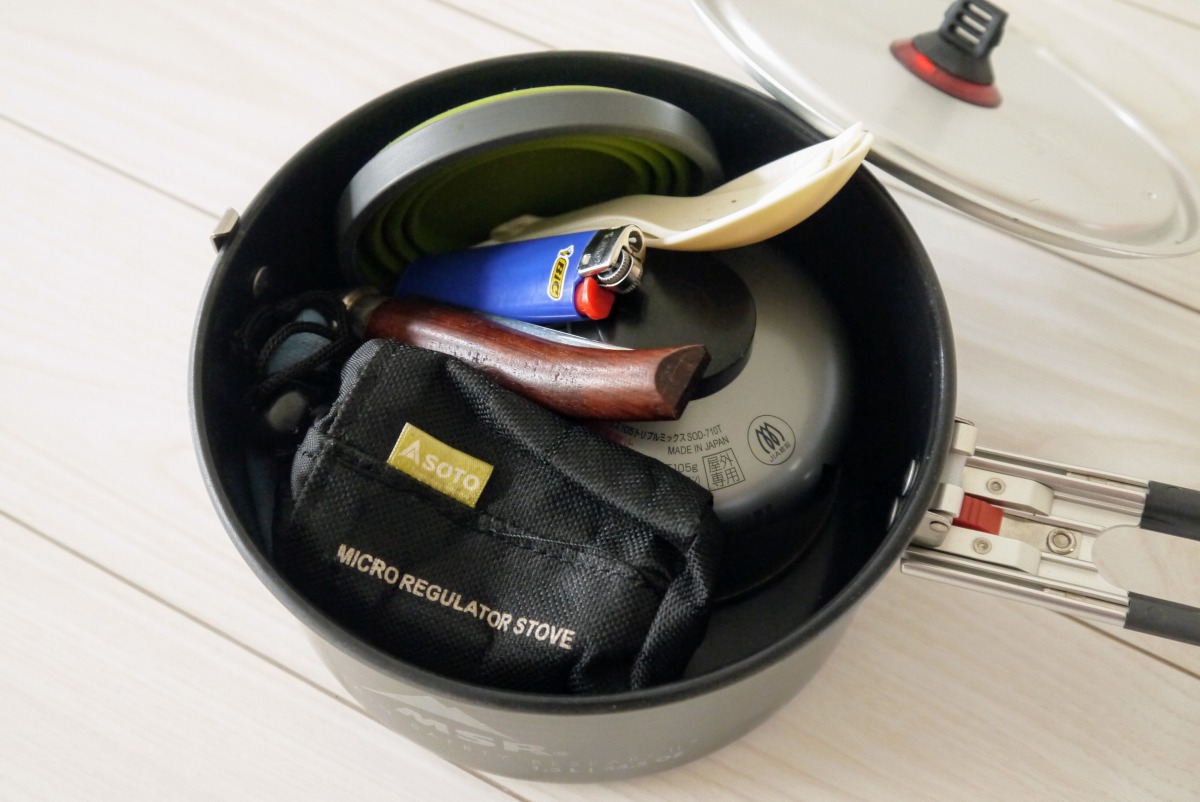 しかし容量が1.3ℓと少し大きくなることで、110ガス缶も含めて、調理に必要な道具を上の写真のようにすべて収納ができるのも大きな利点だろう。MSR/セラミックソロポットは、そうしたスタッキング性もよく考えられたつくりになっている。