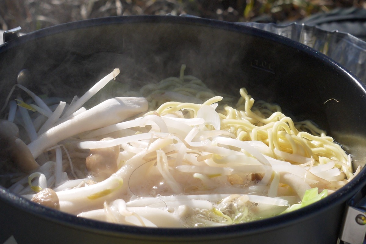 上の写真は、MSR/セラミックソロポットで袋ラーメンと具を茹でているときのもの。