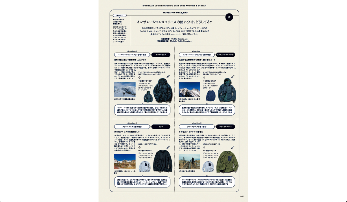 今号の注目企画は、種類が豊富で用途が異なるミドルレイヤー選びとなる2つの記事。冬山での保温ウエア選びは、環境や個人の体感、また山行スタイルによって千差万別。選び方に困っている人もいるのでは?