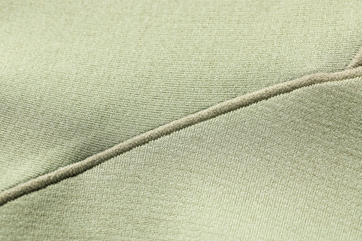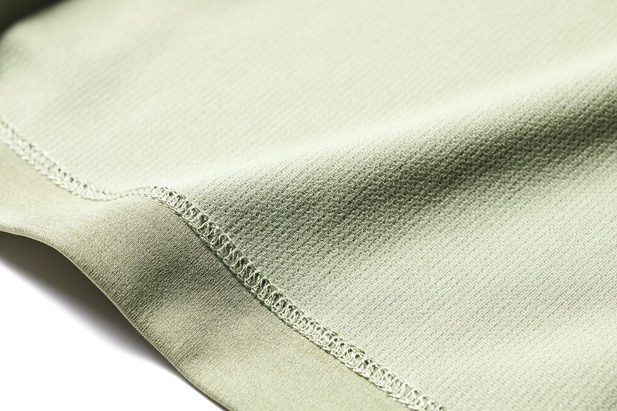 素材は帝人フロンティアの「デルタ」。緻密に編まれたポリエステルニットは、化繊のニットと聞いてイメージするよりもずっとソフトでなめらかな風合いをもつ。高密度の生地は引っ掛かりが少なく、摩擦にも強い。化繊ならではの吸汗速乾性とUPF50の紫外線防止効果も備える。