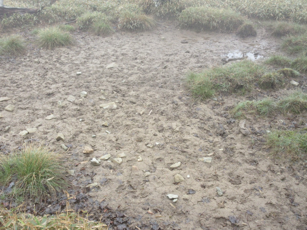▲転がりながら背中のムシをとったりするヌタ場には、シカやテン、アナグマなどの足跡が。