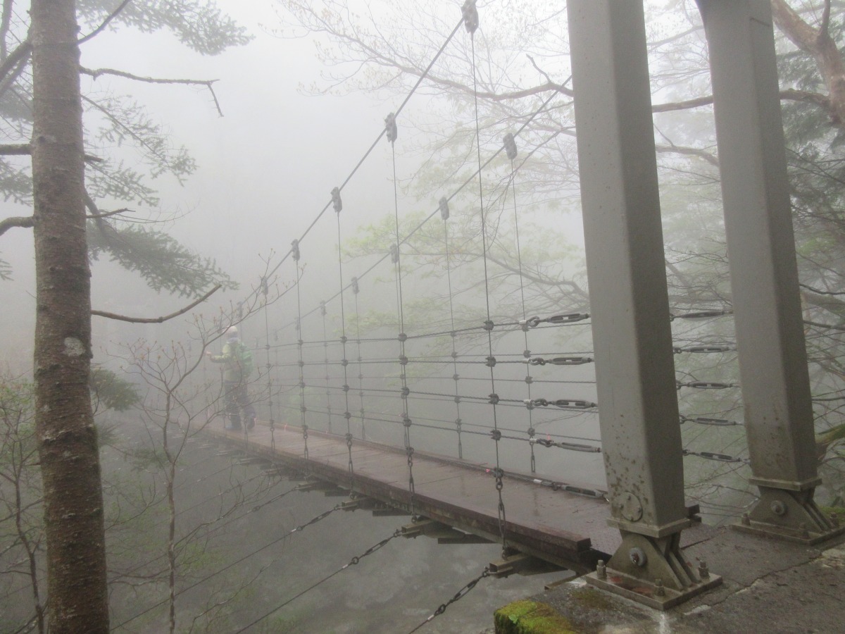 ▲雨が降り、霧に覆われたシオカラ谷の吊り橋。ほんの少し先は、まさにホワイトアウト。