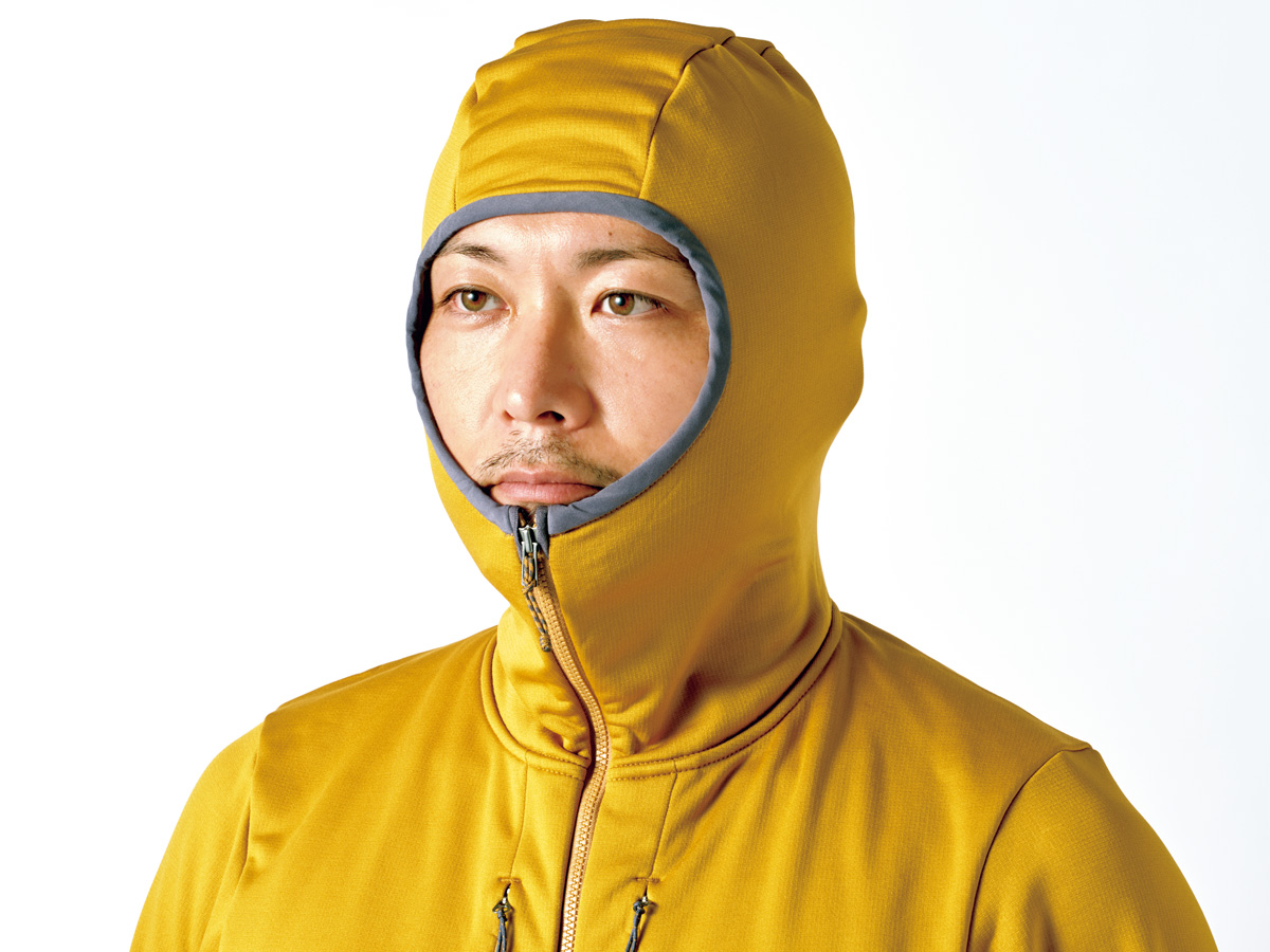 脱がないことを前提にした、ミニマルで機能的なデザイン。ハーネスに干渉しないフロントファスナーは、上下から開閉ができ、フードのフィット感を保ったまま換気ができる。