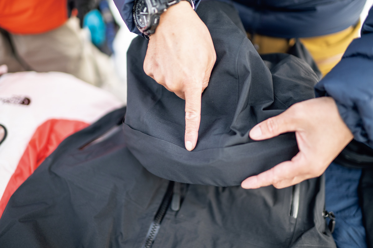 小澤 このジャケットはもともとベントリックスという通気性のある保温材が薄く入っていて、一定の保温性は保たれています。それに上乗せして保温力を増したいときに空気を使うんですよ。あえて三層の生地で作って透湿する袋にしたことで、少しずつ空気は抜けていきますが、それによって破裂もしないし、アクティブインサレーションとしての機能も損なわれない。足りなければまた膨らませばいいわけです。